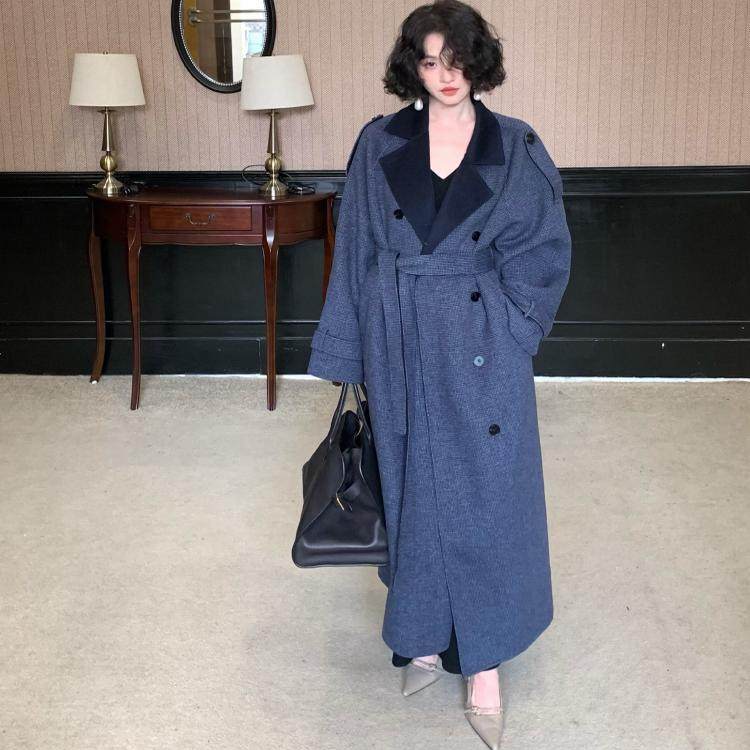淘宝酒午自制【双11】2024秋冬季港风复古翻领羊毛呢子大衣风衣外套女
