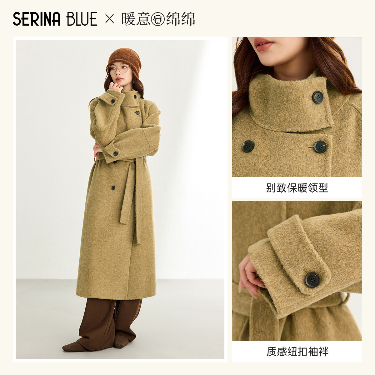 天猫清仓秋冬!SerinaBlue立领高级感双排扣风衣款绵羊毛大衣外套女