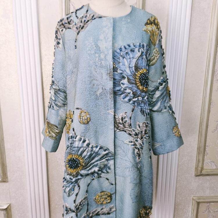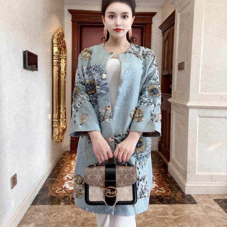 淘宝欧洲站2025春夏新款名媛气质圆领长袖浮雕印花重工钉珠风衣外套潮