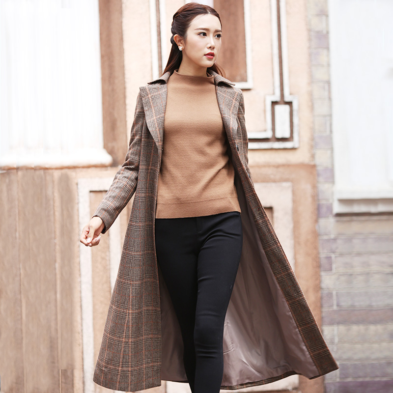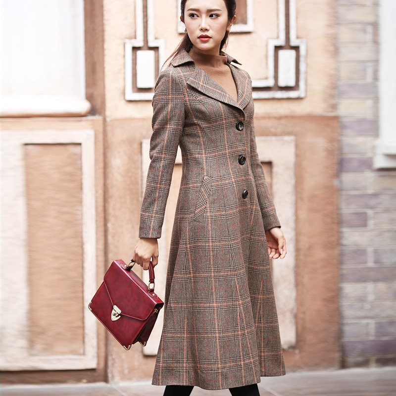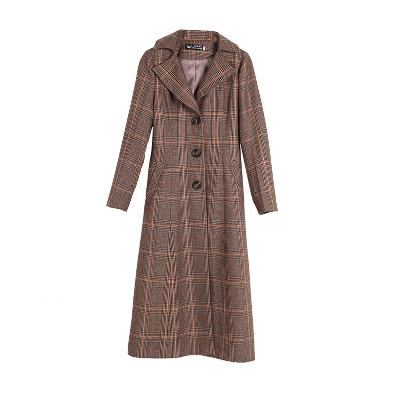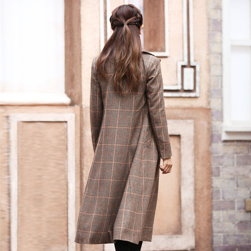 淘宝2020秋冬新款复古简约格子毛呢外套女装修身显瘦长风衣单排扣大衣