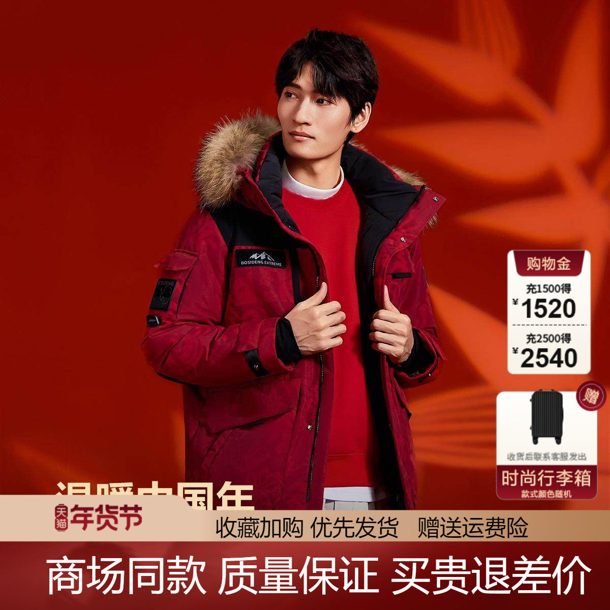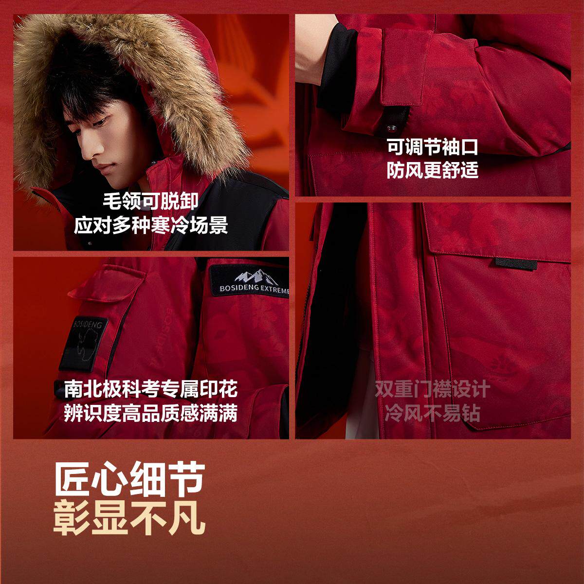 天猫波司登东北户外极寒系列男中长款加厚鹅绒防寒工装新年红色羽绒服