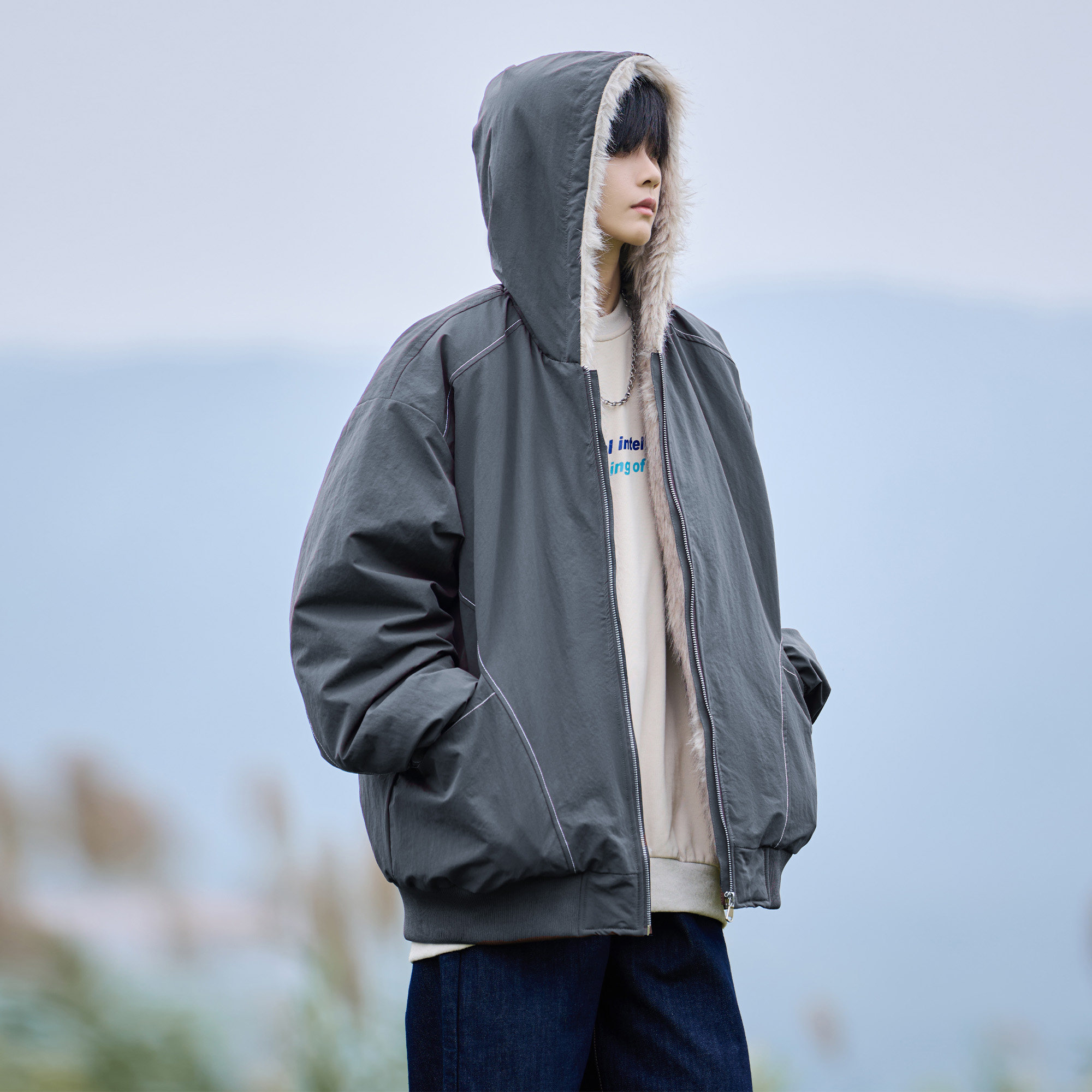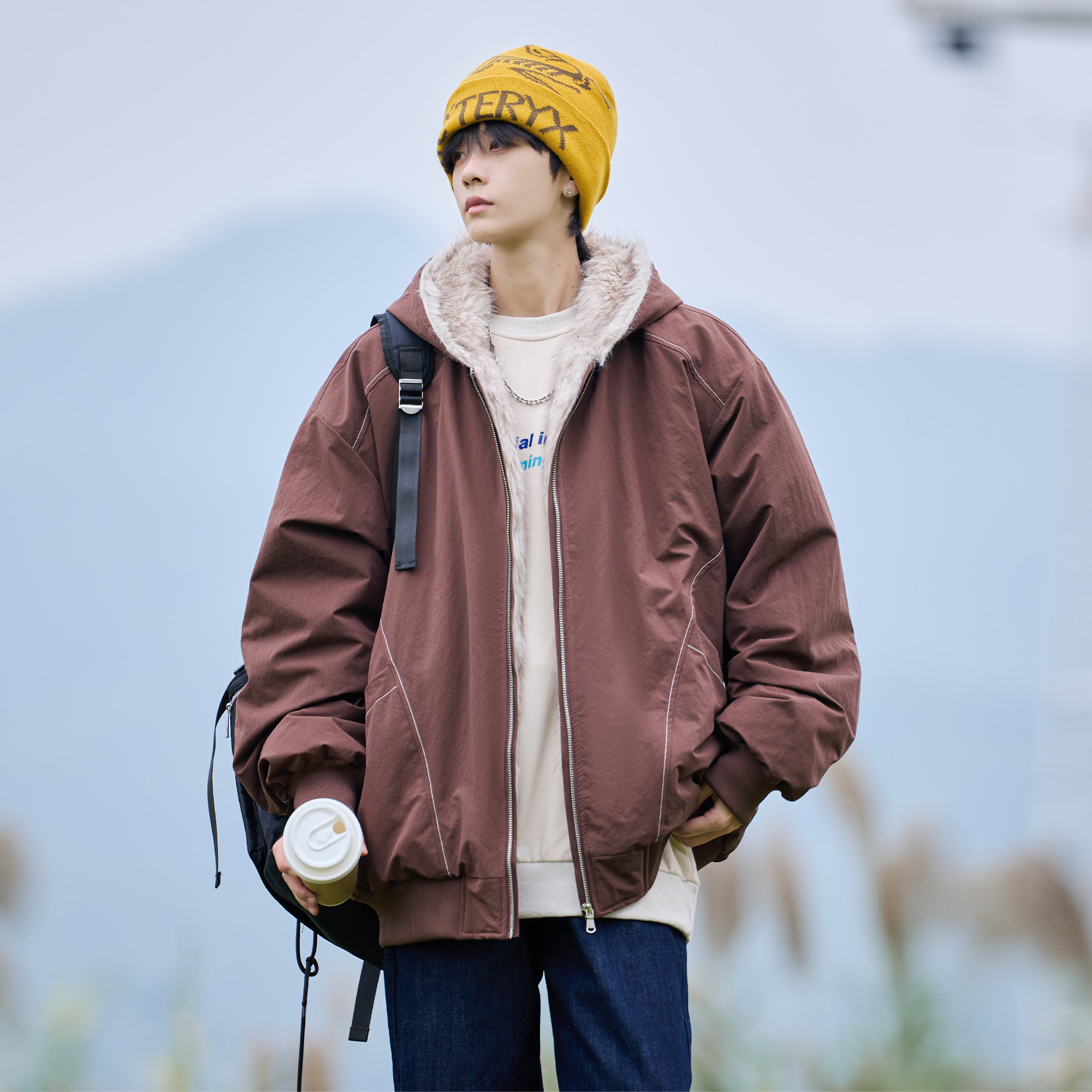 森马羽绒服男2024冬季新款复古仿皮衣薄款短夹克撞色拼接外套毛领