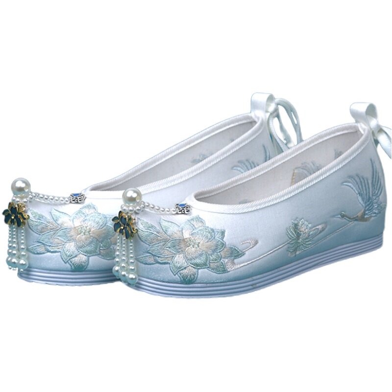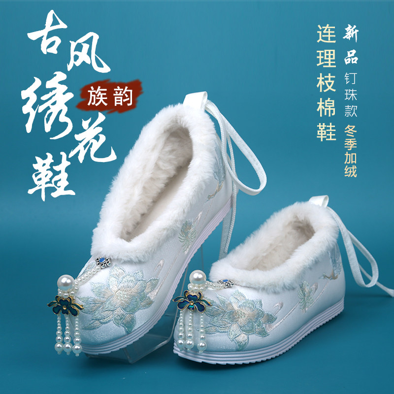 淘宝春秋新款搭配古风汉服的鞋子女绣花鞋内增高弓鞋翘头珍珠古装布鞋