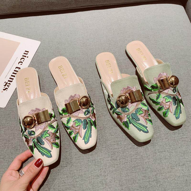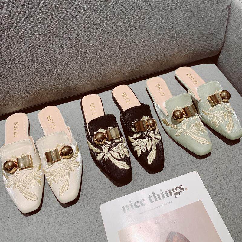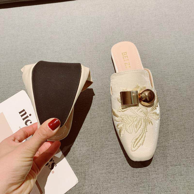 懒人鞋凉拖鞋女外穿2023夏季时尚尖头绣花半拖平底鞋包头穆勒鞋女
