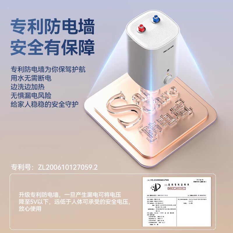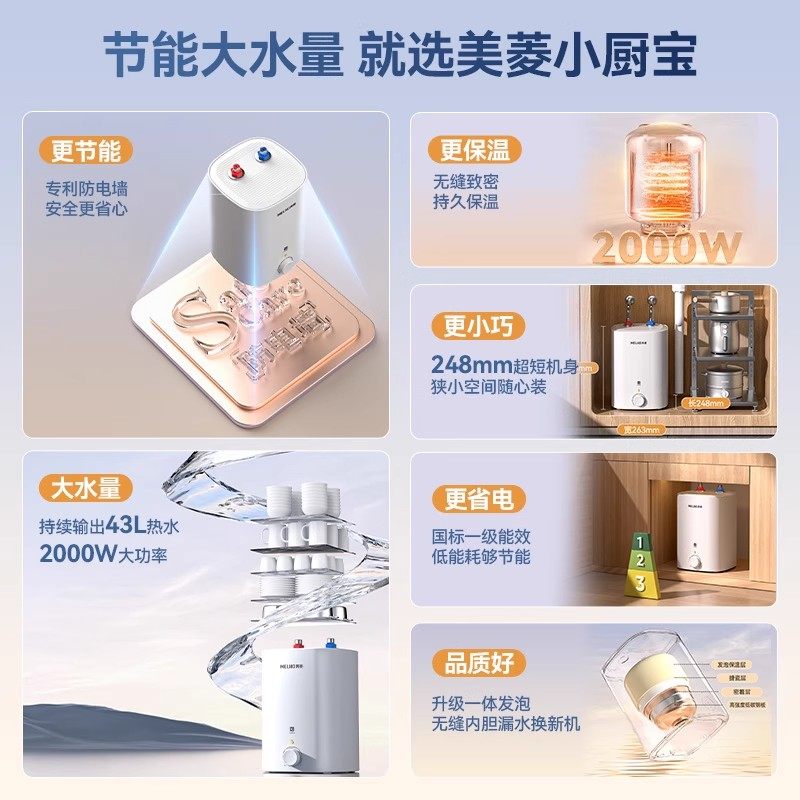 美菱小厨宝热水器是一款专为厨房设计的家用储水式电热水器,体积小巧,可灵活安装于水槽下方或台面角落,节省空间。采用高效加热技术,快速出热水,满足日常洗碗、洗菜、洗手等需求,告别冷水困扰。内置优质内胆,防腐耐用,搭配多重安全保护(如防干烧、防漏电、超温保护),使用更安心。节能环保,按需加热,避免能源浪费。特别适合家庭厨房、小户型或出租房使用,安装简便,操作便捷。美菱小厨宝以实用、安全、高效为核心,提升厨房生活品质,是现代家庭提升舒适度的理想选择。