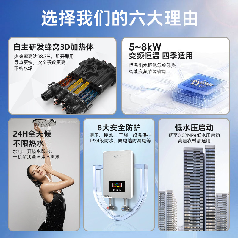 淘官方正品即热式电热水器变频恒温超薄家用速热式小型洗澡理发店
