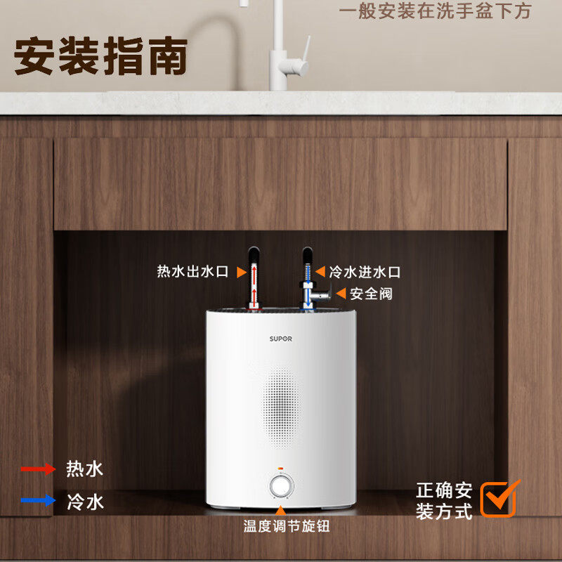 苏泊尔UK08plus小厨宝是一款专为厨房设计的小型台下式电热水器,采用速热储水技术,即开即热,满足日常洗菜、洗碗等热水需求。机身小巧,安装灵活,可轻松嵌入橱柜下方,节省空间。配备3000W大功率加热管,快速升温,8L储水量满足多口之家使用。内置双重安全防护(防干烧、防超温)和IPX4防水等级,使用更安心。智能温控系统精准调节水温,节能省电。不锈钢内胆耐腐蚀、寿命长,搭配高效保温层,持久锁热。UK08plus兼顾实用性与安全性,是提升厨房舒适度的理想选择,让热水生活更便捷。