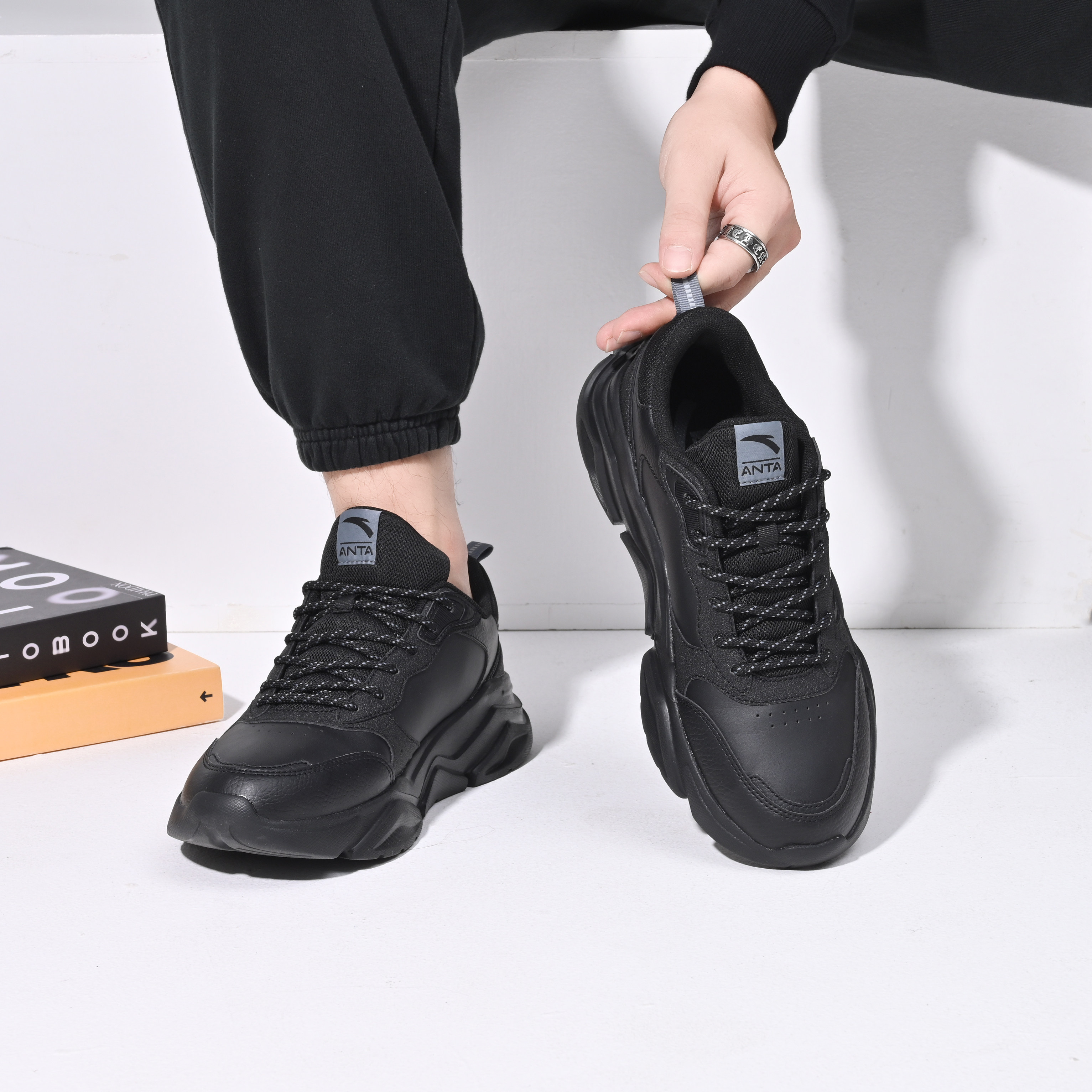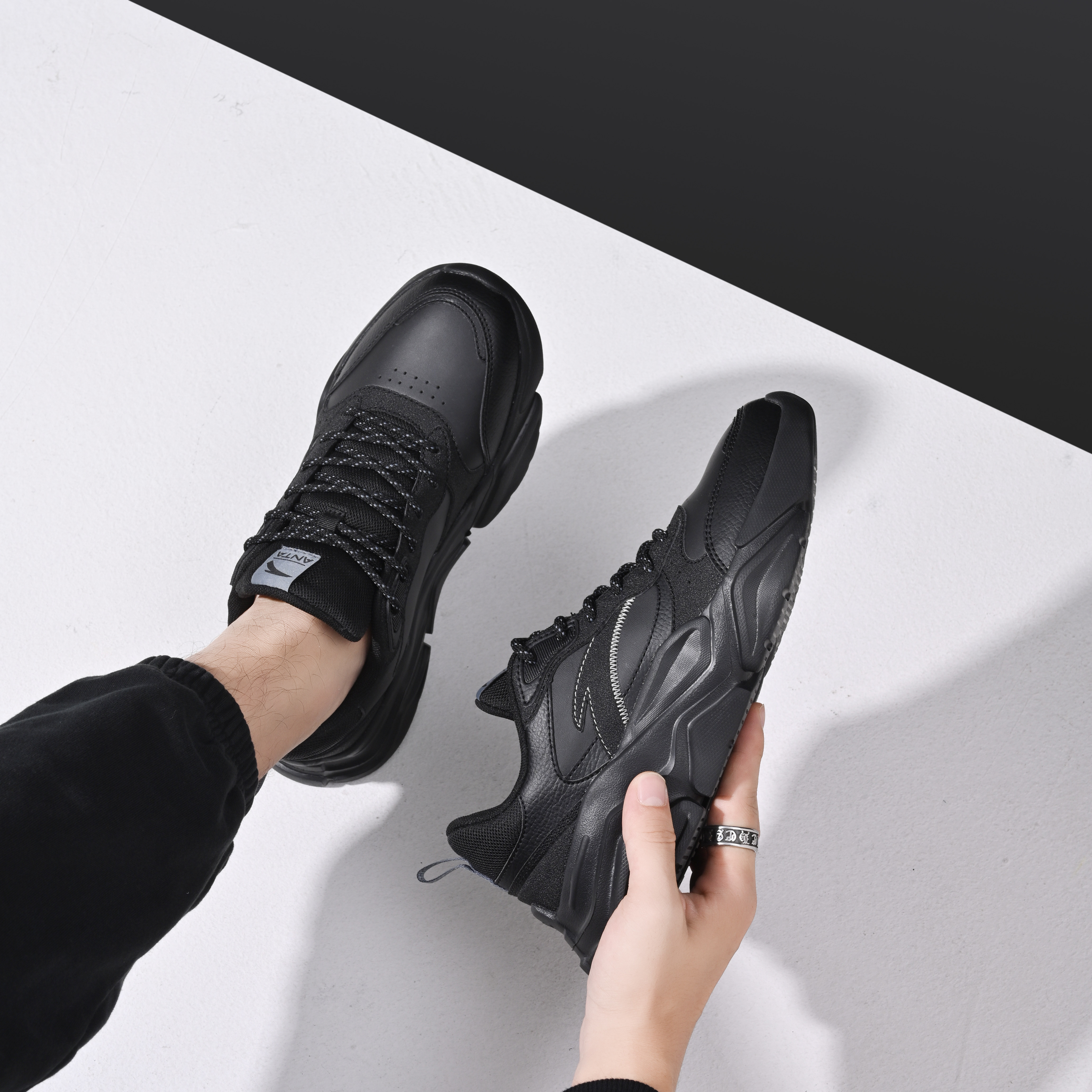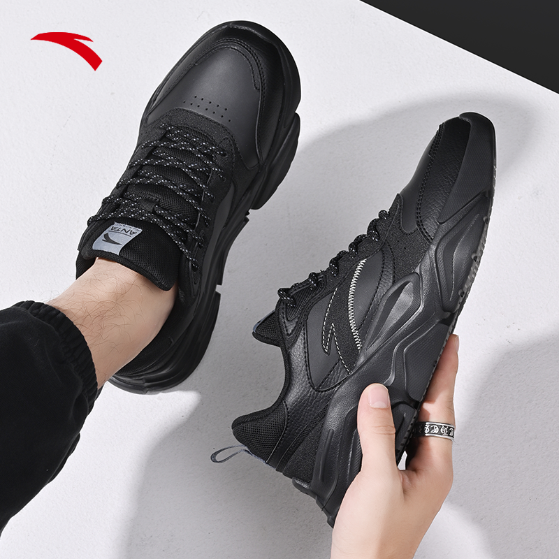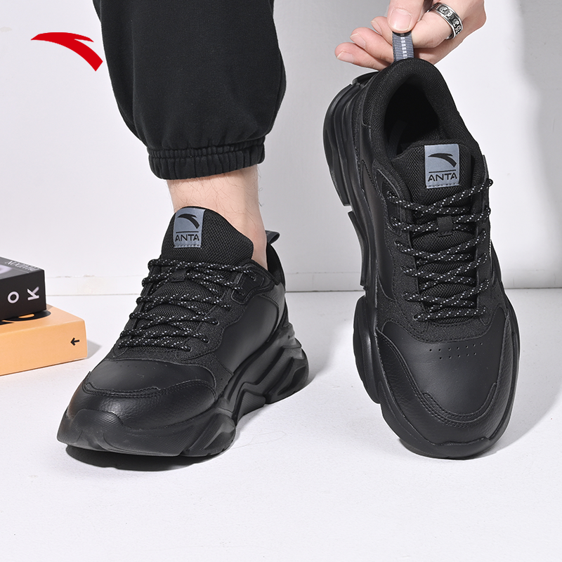 天猫安踏男鞋老爹鞋冬季黑色皮面防水厚底增高休闲鞋男士通勤鞋跑步鞋