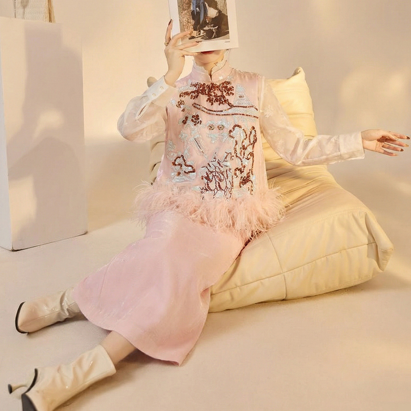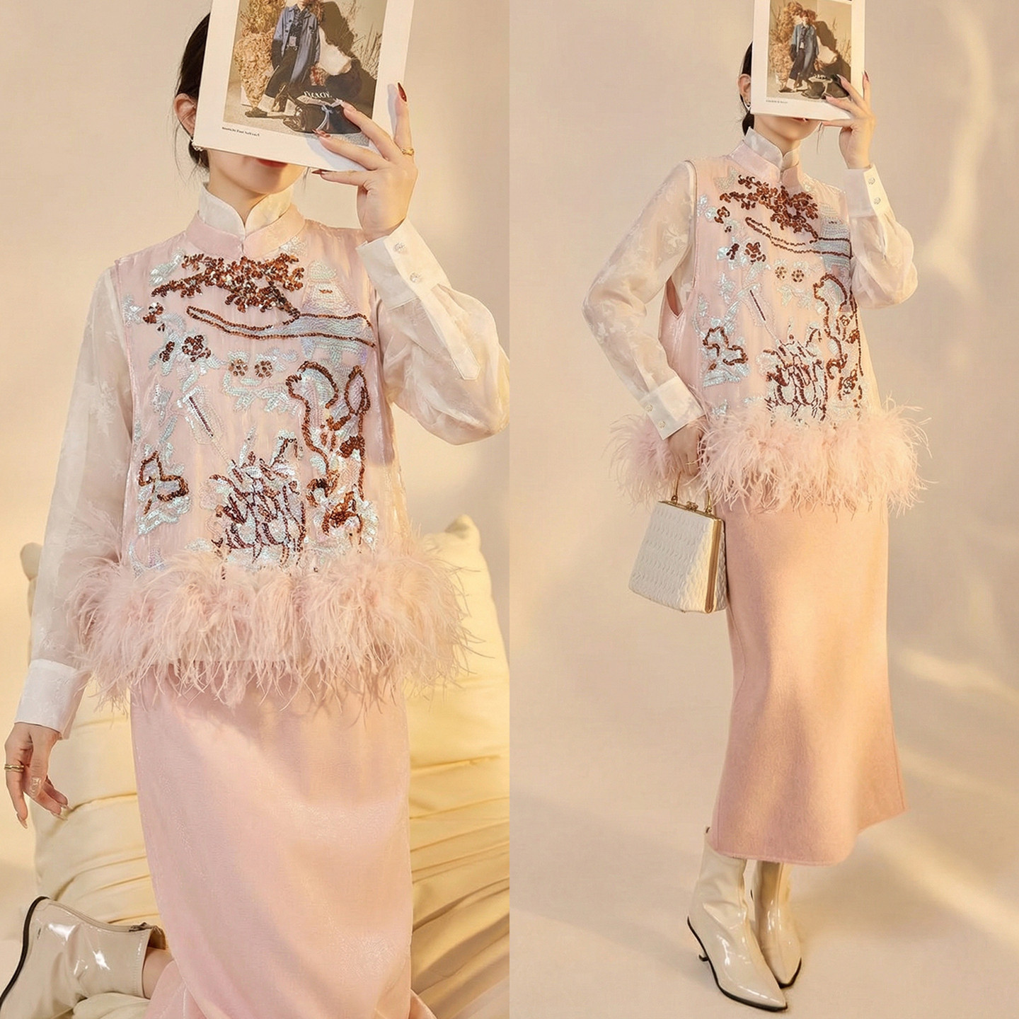 AYOMIS【蒋欣同款】新中式珠绣羽毛马甲蕾丝衬衫粉色半身裙3件套,融合传统东方美学与现代时尚设计,展现优雅灵动的女性魅力。上衣采用精致蕾丝工艺,搭配重工珠绣与轻盈羽毛装饰马甲,层次丰富,细节考究;下装为柔美金粉色半身裙,剪裁合体,凸显腰线。整体造型既具古典韵味,又不失浪漫气息,完美适配日常通勤、约会聚会等场合。蒋欣同款加持,更添明星气质,是追求质感与风格女性的理想之选,演绎新中式穿搭新风尚。