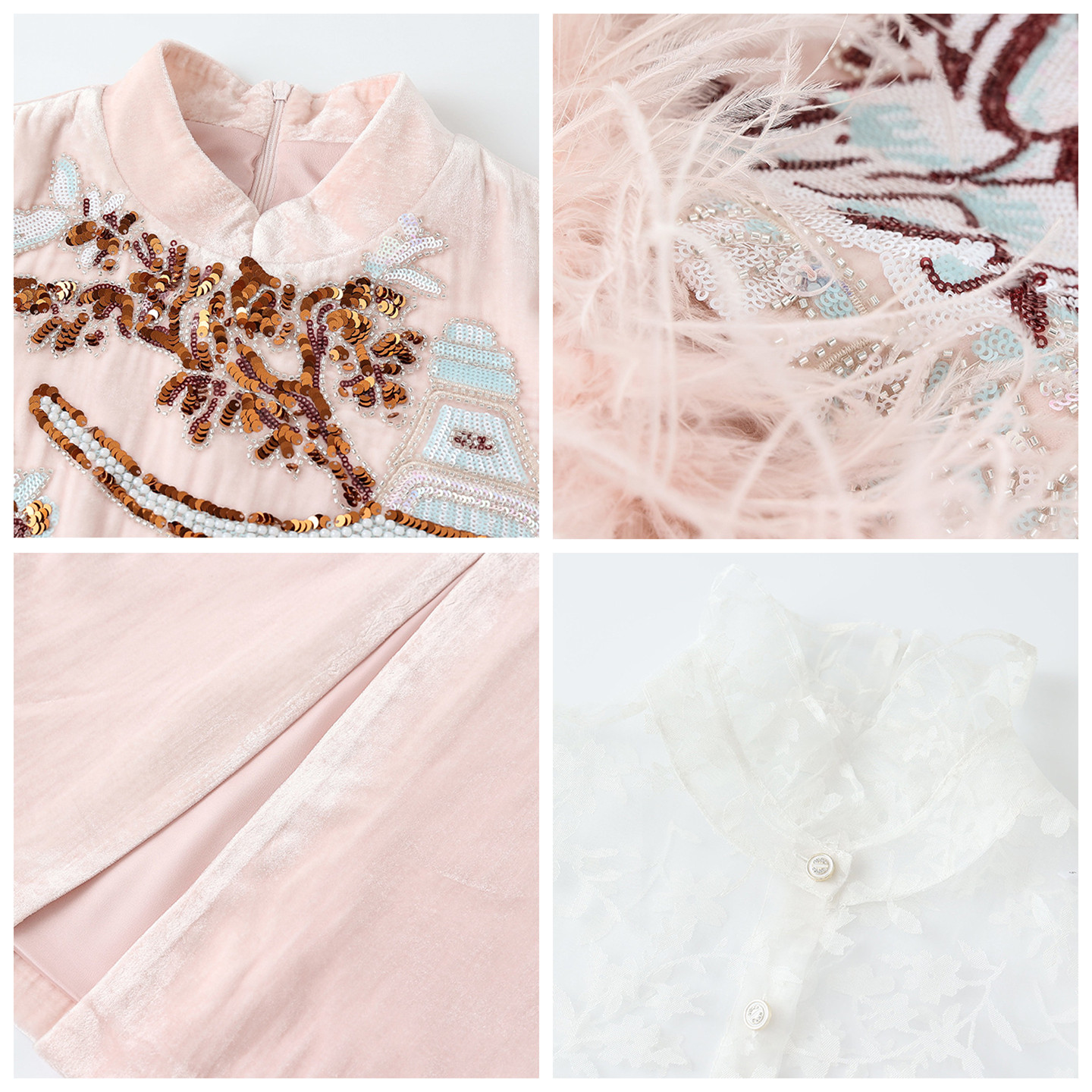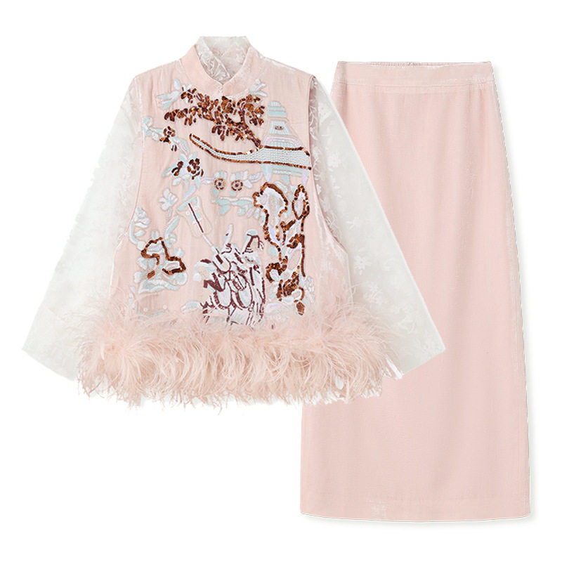 淘宝AYOMIS【蒋欣同款】新中式珠绣羽毛马甲蕾丝衬衫粉色半身裙3件套