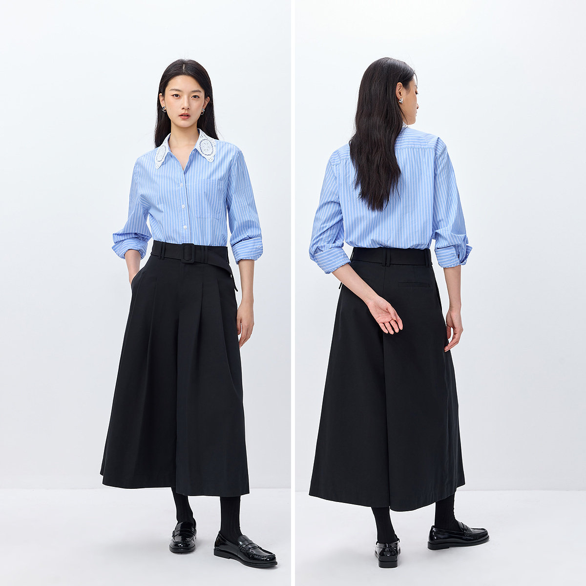 淘伊系の一套入!韩版Polo领蓝色条纹衬衫+高腰显瘦休闲直筒阔腿裤