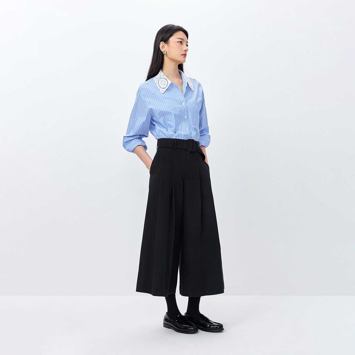 伊系の一套入!韩版Polo领蓝色条纹衬衫+高腰显瘦休闲直筒阔腿裤