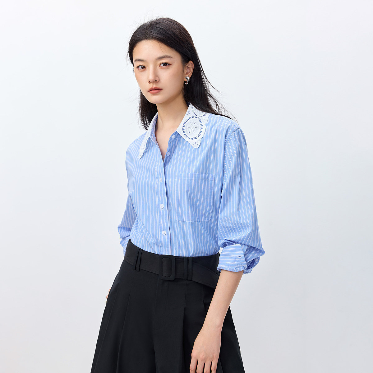 天猫LILY2026春新款纯棉法式蕾丝翻领条纹宽松休闲气质通勤衬衫外套女
