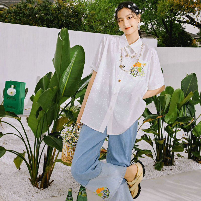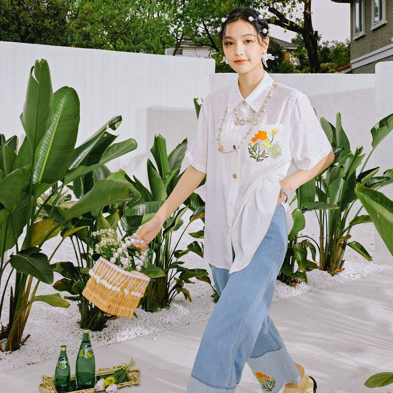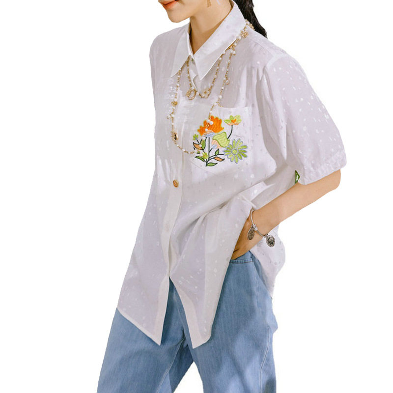 淘宝复古花朵口袋刺绣宽松衬衫~韩版经典百搭通勤白色衬衣女生SG8862