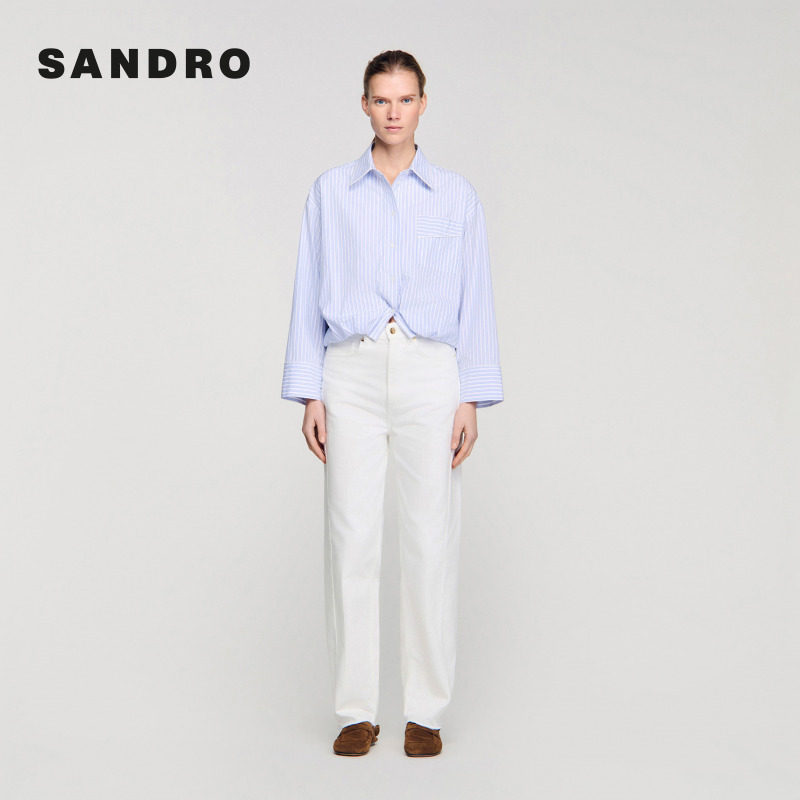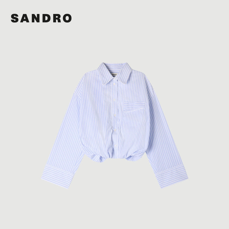 天猫SANDRO2026春季新款女装法式时尚棉质蓝白条纹落肩袖宽松短款衬衫