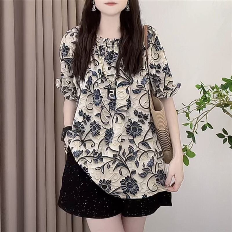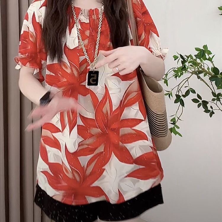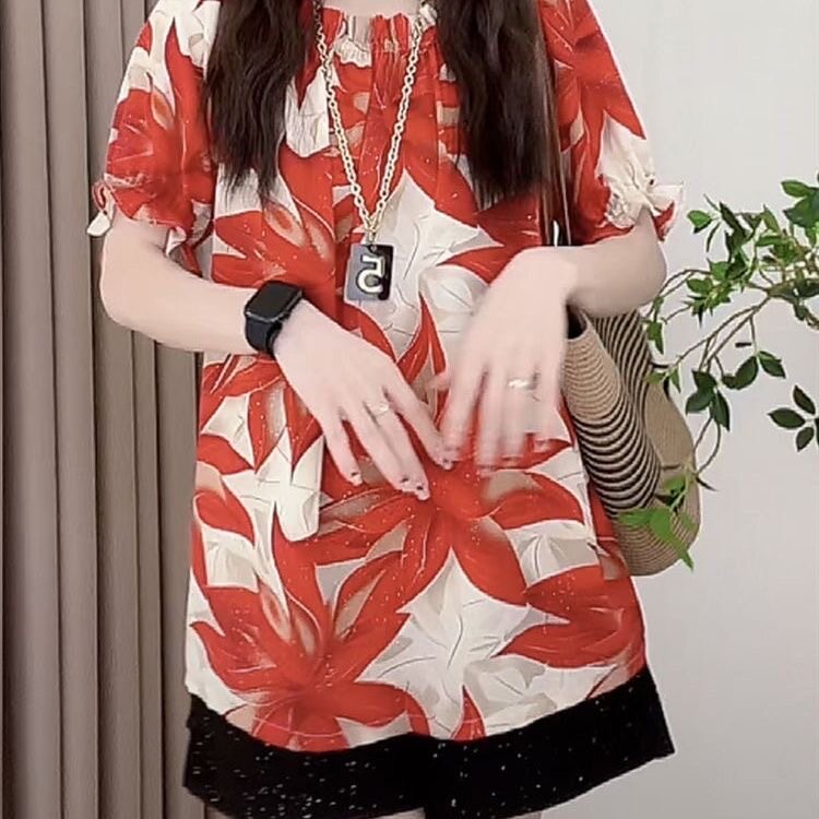 淘宝大码胖mm法式气质甜美风荷叶边碎花衬衫女夏季遮肚子显瘦短袖上衣