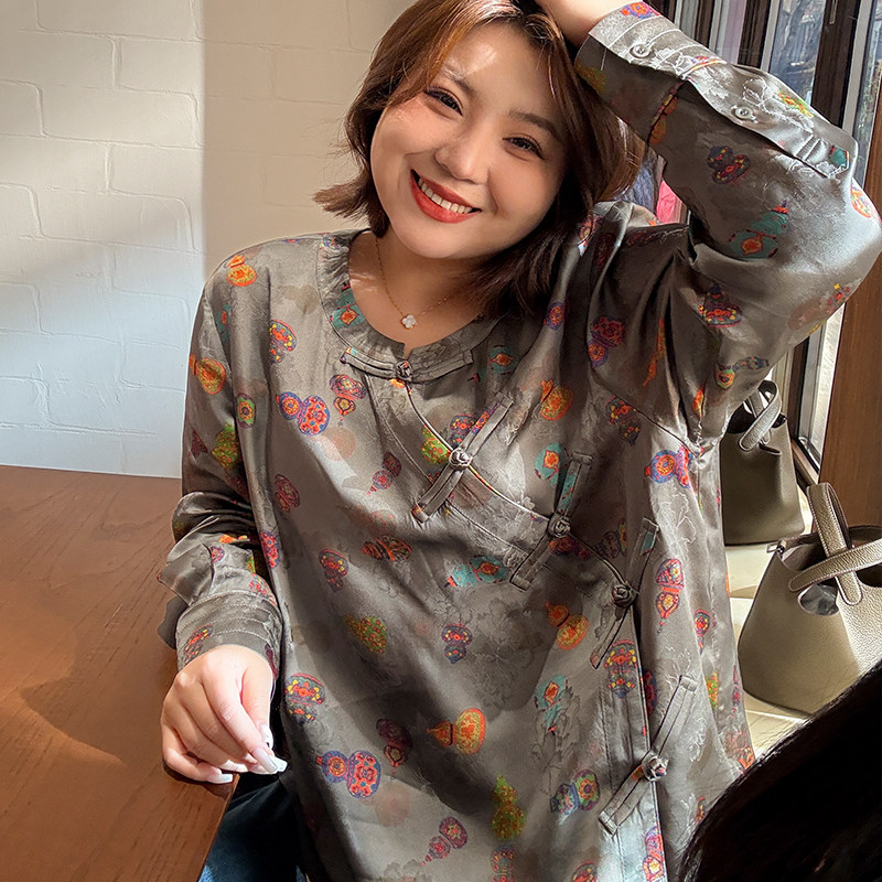 淘宝胖mm新年提花新中式衬衫木子理想大码女装斜襟盘扣古韵衬衣200斤