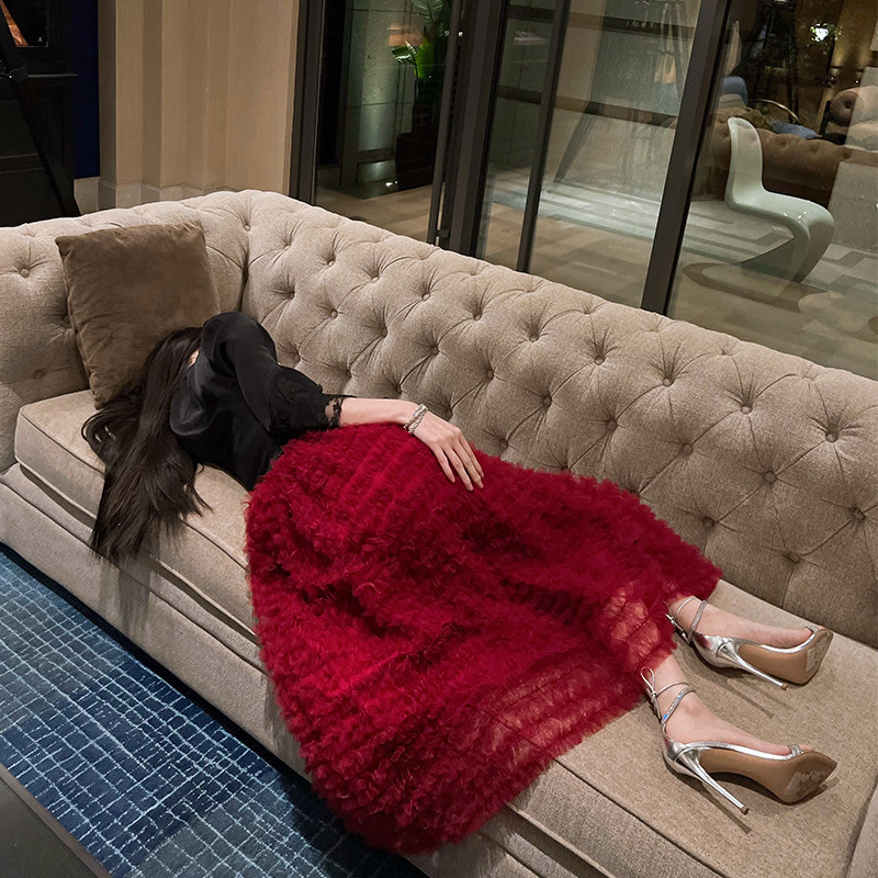 淘宝熊熊屋【韩女穿搭】v领蕾丝泡泡袖衬衫明艳朱砂红网纱半裙两件套