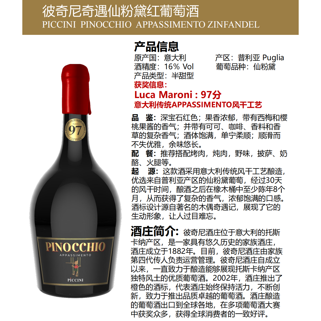 淘宝金奖97分!意大利pinocchio彼奇尼匹诺曹奇遇半甜红葡萄酒礼盒装