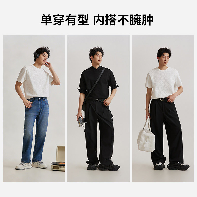 【轻奢肌理提花】卡宾2026夏季新款新中式男装短袖T恤,融合东方美学与现代剪裁,以精致提花工艺呈现细腻肌理,低调中彰显品质感。精选高品质棉质面料,亲肤透气,适合夏日穿着。设计上汲取传统纹样灵感,结合简约廓形,既保留中式韵味,又契合都市休闲风格。领口与袖口细节考究,走线工整,凸显匠心工艺。无论是日常通勤还是周末出游,都能轻松驾驭,展现从容雅致的现代男性魅力。卡宾以创新诠释新中式时尚,为追求质感与格调的男士打造兼具文化内涵与实穿性的夏日之选。