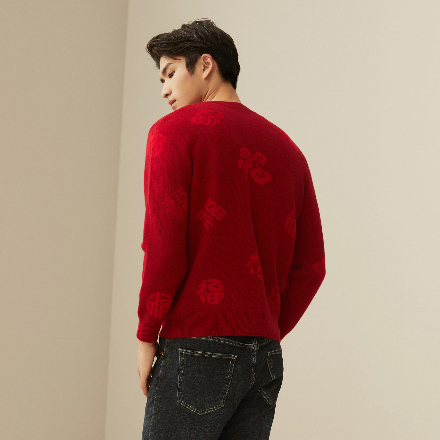 淘色系儒雅 2025新款男士商务休闲圆领提花加厚100纯山羊绒套衫长袖