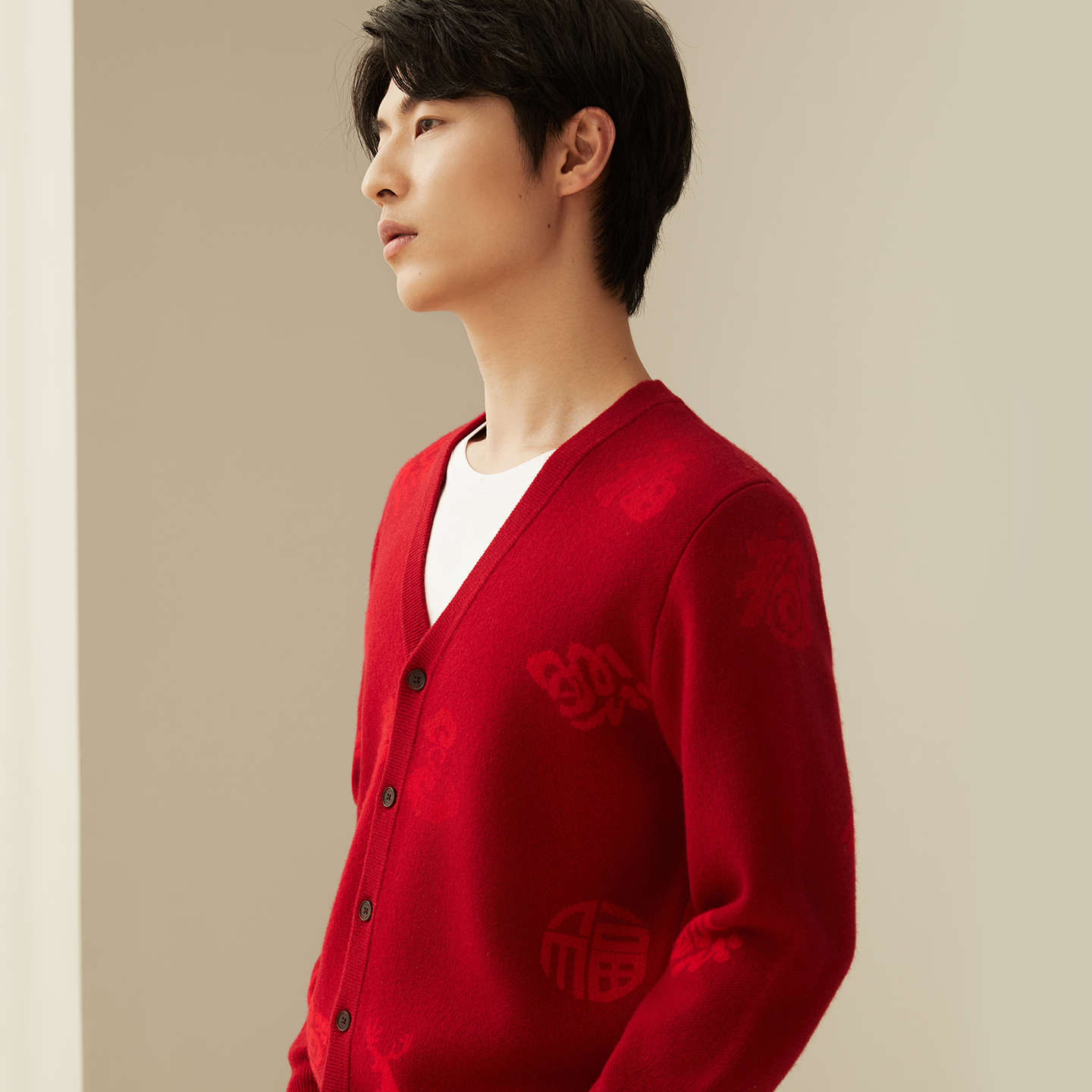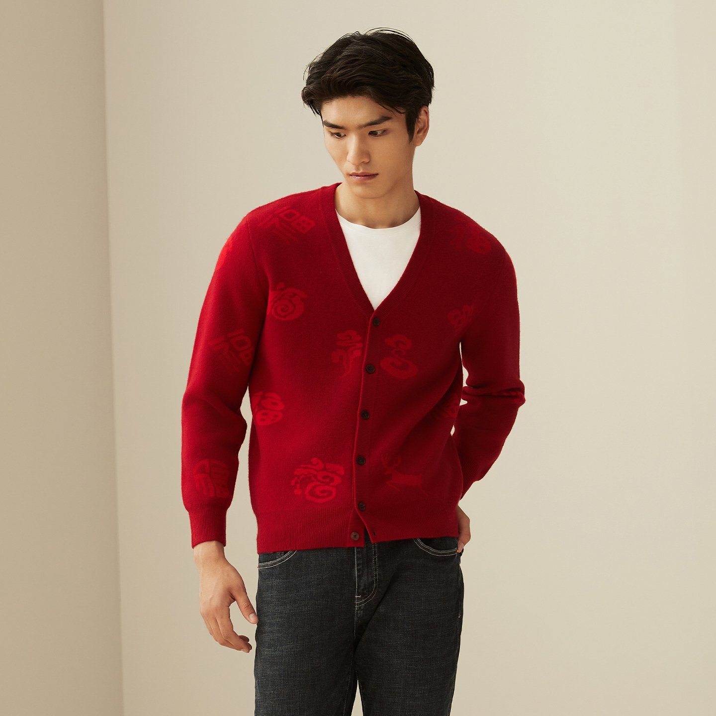 天猫鹿王100%纯山羊绒开衫男士领保暖纯色商务保暖提花针织衫秋冬新款