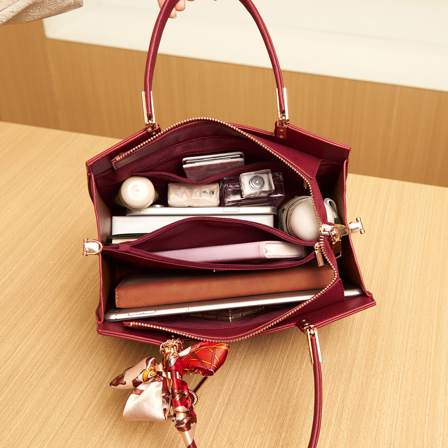 这款红色大容量女士手提包,专为婚礼、婚宴等重要场合设计,兼具实用与高级感。采用优质皮质,色泽饱满,质感细腻,彰显优雅气质。包身结构宽敞,分层合理,轻松容纳手机、钱包、化妆品等日常用品,特别适合妈妈、婆婆或伴娘使用。可手提、可斜挎,多种背法随心切换,舒适便捷。经典正红色寓意喜庆吉祥,是新娘婚礼搭配或长辈出席婚宴的理想选择。无论是中式婚礼还是西式庆典,都能完美融入氛围,展现端庄大方又不失时尚品味,是婚礼季的必备精品女包。