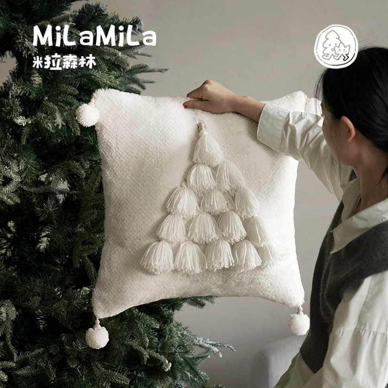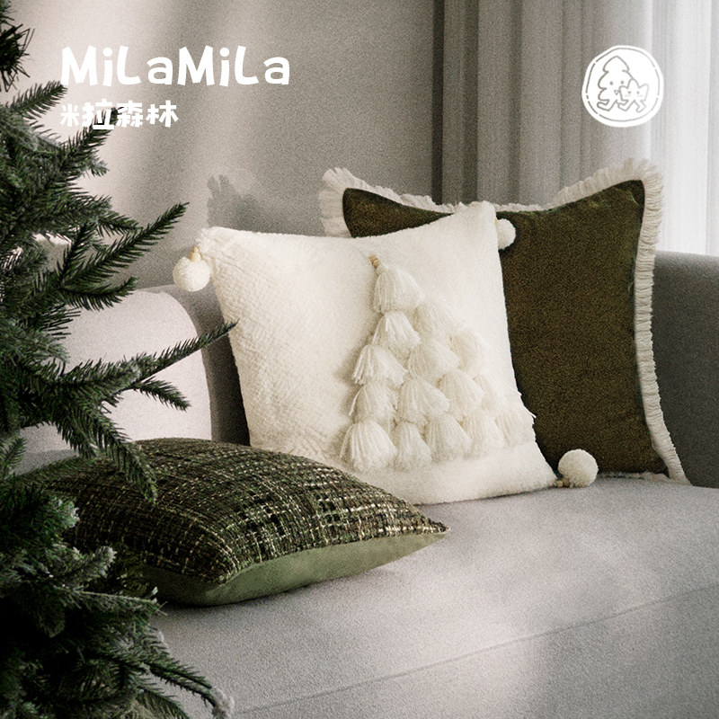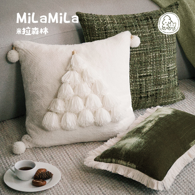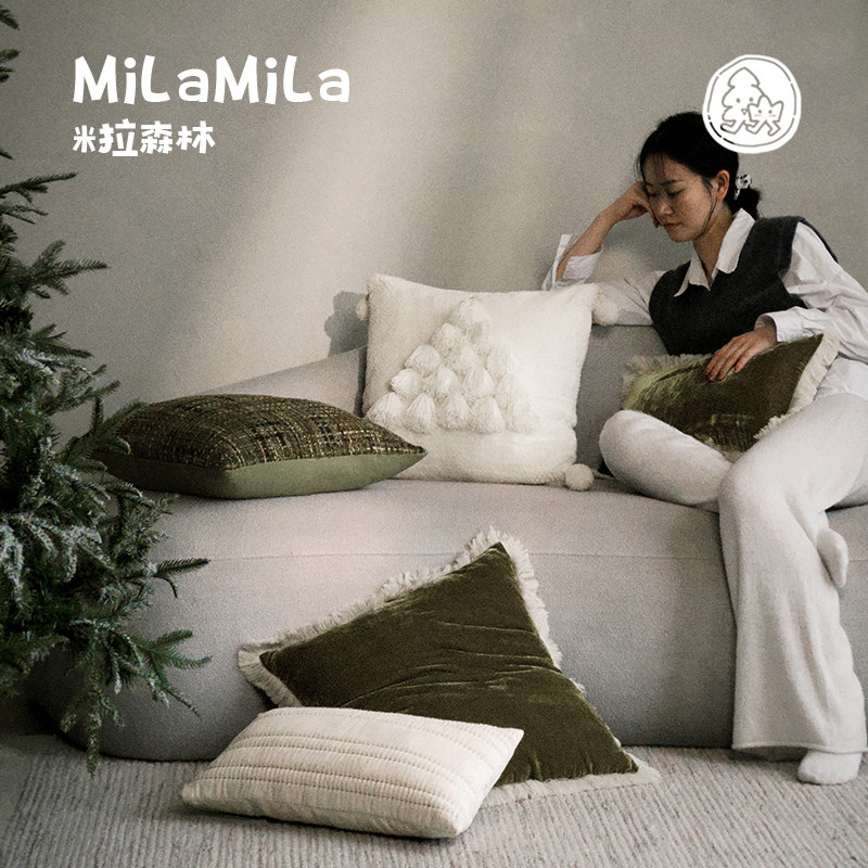 淘宝MILA米拉毛绒抱枕绿色装饰客厅卧室腰枕靠垫流苏披毯高级腰垫枕套