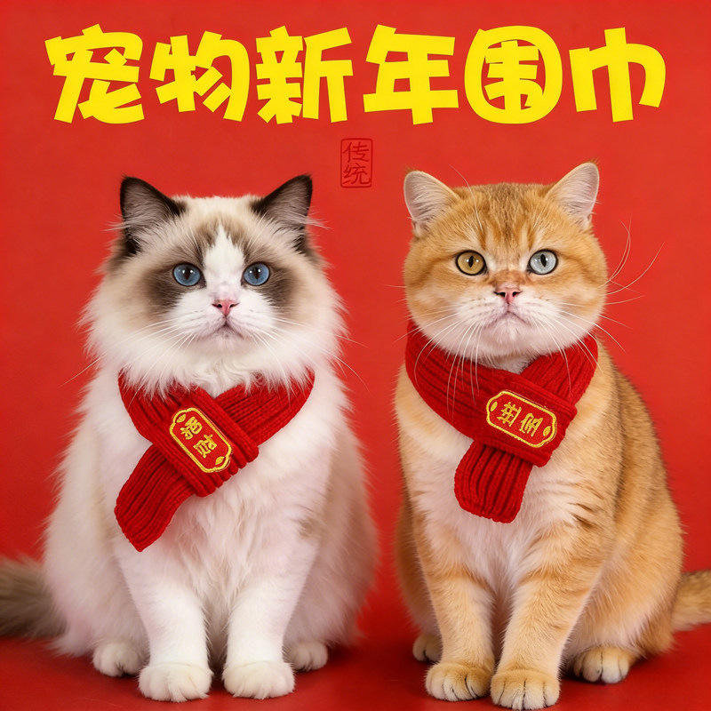 天猫新年围脖猫咪小狗可爱新品毛线宠物围巾围兜狗狗保暖配饰红色喜庆