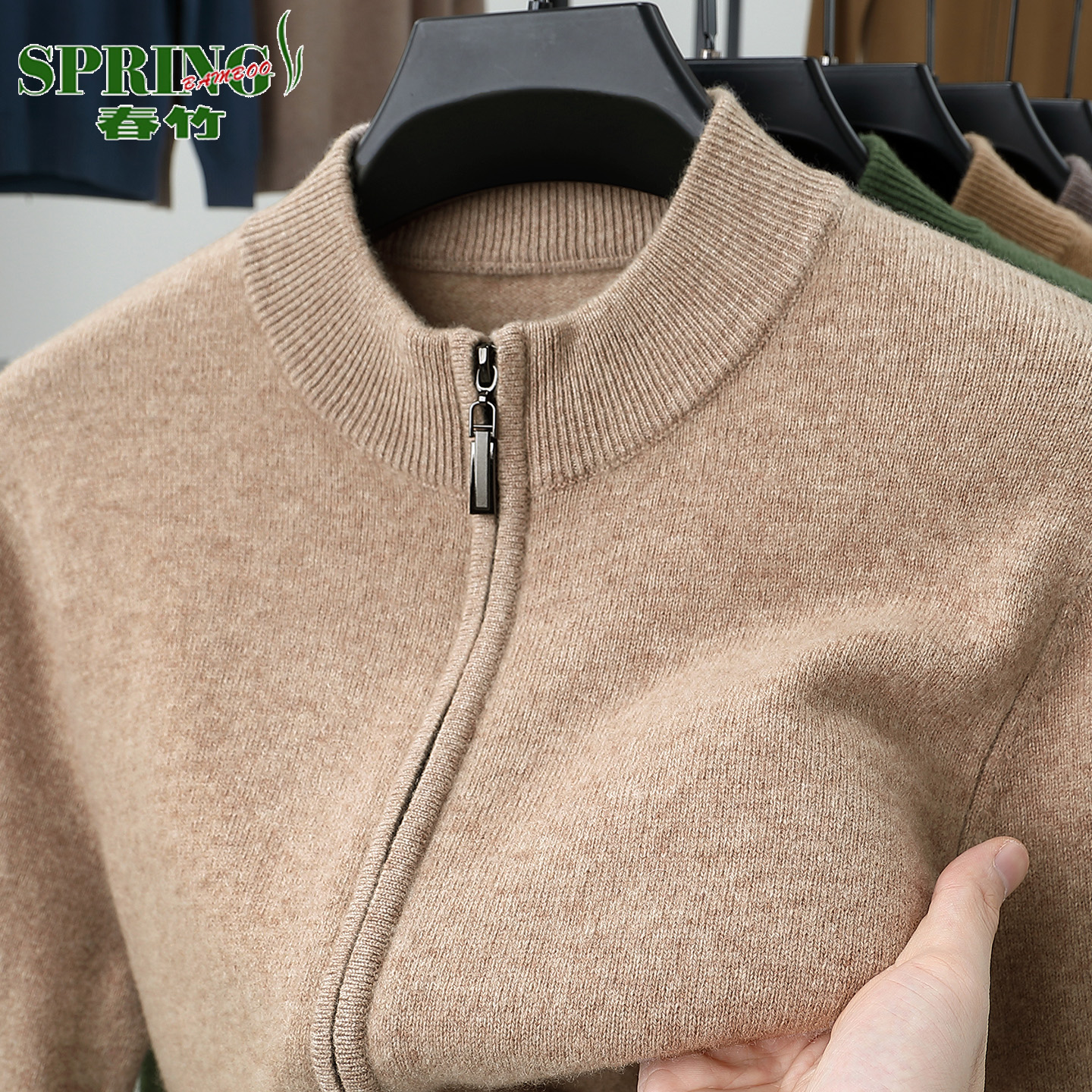 淘宝春竹纯羊绒开衫外套男新款加厚立领拉链毛衣中年宽松大码针织衫