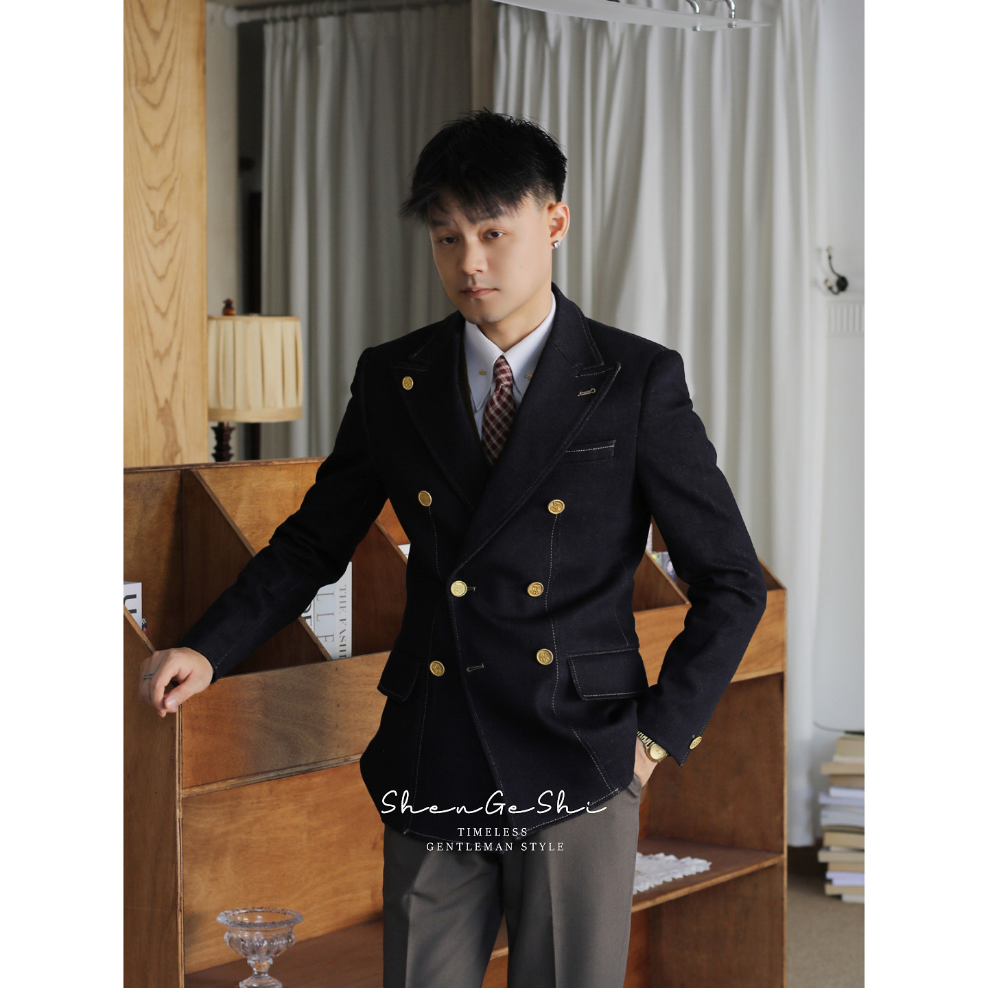 这款复古英伦风金扣牛仔布雷泽西装外套,融合经典学院风与现代修身剪裁,彰显绅士格调。采用高品质牛仔面料,质感挺括且富有复古韵味,双排扣设计搭配精致金色纽扣,提升整体视觉层次与优雅气质。肩线利落,腰身微收,凸显身形线条,兼具休闲与正式感。无论是搭配衬衫领带出席半正式场合,还是配以T恤打造日常英伦造型,皆能轻松驾驭。细节处如翻领设计、口袋装饰及内里做工,无不体现匠心工艺。是追求个性与品味男士衣橱中不可或缺的时尚单品,完美诠释复古与现代的优雅碰撞。