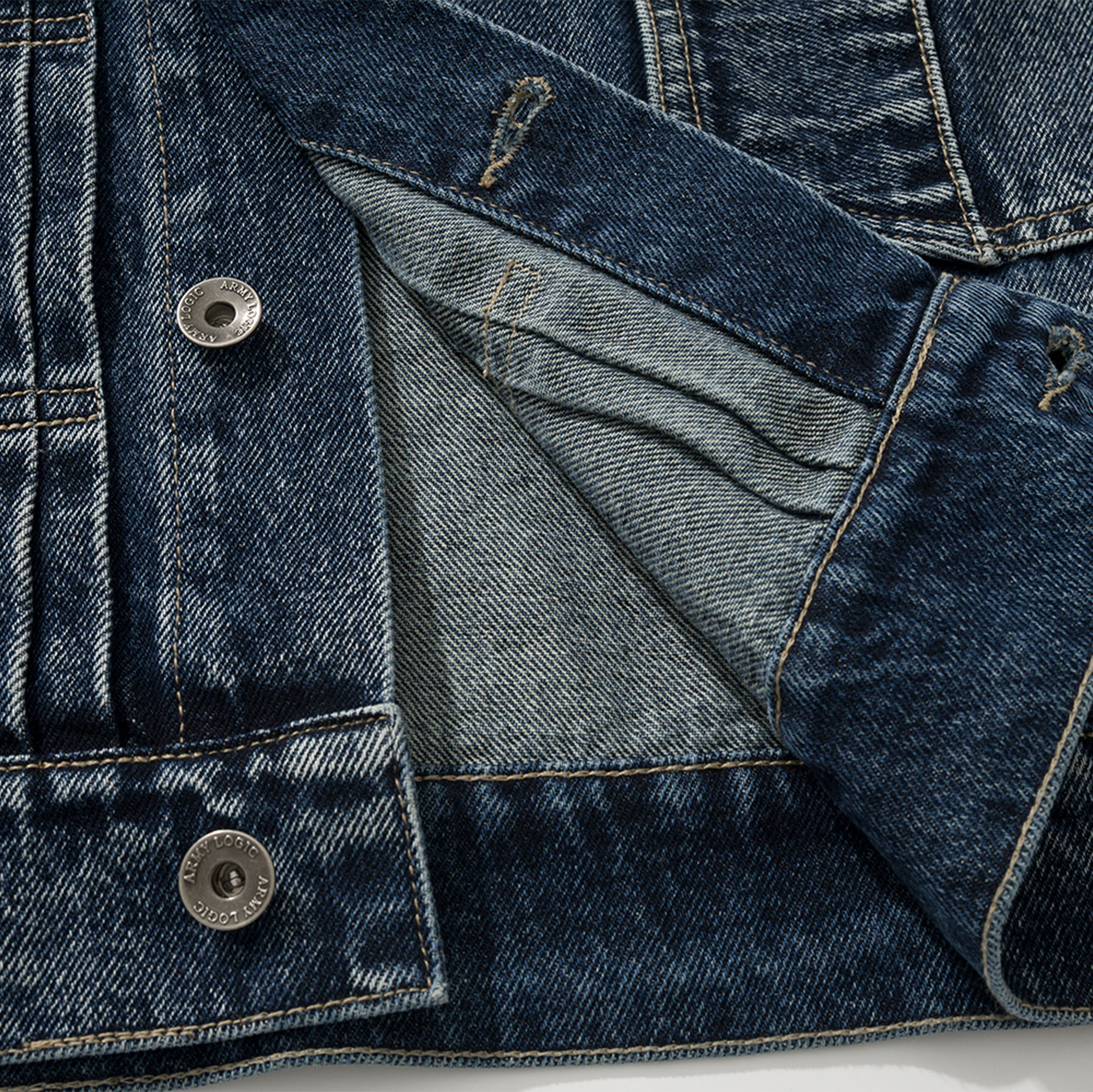ArmyLogic25SS春夏男士牛仔外套,以简约时尚为核心理念,融合创新拼布设计,打造独特视觉层次。采用优质轻薄牛仔面料,兼顾舒适透气与挺括质感,完美适配春夏季节穿搭。宽松剪裁设计,穿着自在无束缚,轻松驾驭多种体型。经典翻领与单排扣门襟,细节精致耐看,袖口与下摆的拼布元素增添个性亮点,彰显潮流态度。无论是搭配T恤、衬衫或休闲裤,都能轻松塑造都市型男风范。ArmyLogic25SS牛仔外套,是追求风格与实穿性兼具的男士的理想选择,演绎随性而不失格调的春夏时尚。