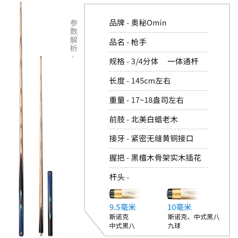 OMIN奥秘新款枪手通杆台球杆,专为追求精准与稳定性能的台球爱好者打造。采用优质北美枫木材质,搭配小前节设计,兼具斯诺克与中式黑8的通用性,击球反馈清晰,控球精准。一体式通杆结构有效提升力量传导,减少震动,带来更稳定的出杆体验。杆身经精细打磨与多层涂装,手感顺滑,耐用性强。配备高品质皮头与铜箍,确保击球力度与旋转控制。无论是专业训练还是日常娱乐,OMIN奥秘枪手通杆都能满足多样需求,是台球爱好者值得信赖的进阶之选。