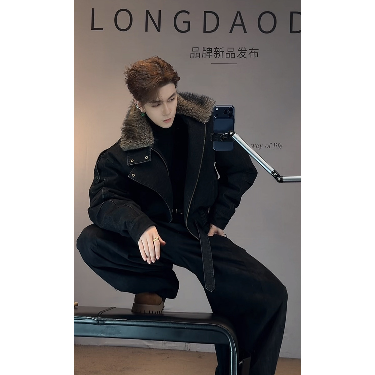 淘宝龙叨叨冬季新款潮流美式复古工装可拆卸羽绒服百搭毛领牛仔外套