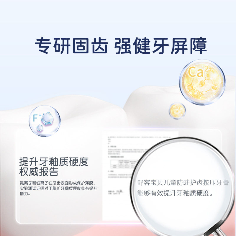舒客宝贝儿童牙膏专为2-12岁换牙期宝宝设计,采用低氟配方,有效抗酸防蛀,温和守护乳牙与恒牙健康。特别添加钙质成分,帮助强化牙釉质,促进牙齿坚固发育。牙膏采用创新按压式设计,使用方便,避免浪费,让孩子爱上刷牙。清新草莓味口感温和,不刺激口腔,提升宝宝刷牙兴趣。产品通过安全测试,不含防腐剂与有害成分,家长更放心。舒客宝贝致力于儿童口腔护理,科学配方与贴心设计相结合,为宝宝换牙期提供全面防护,守护灿烂笑容从“齿”开始。