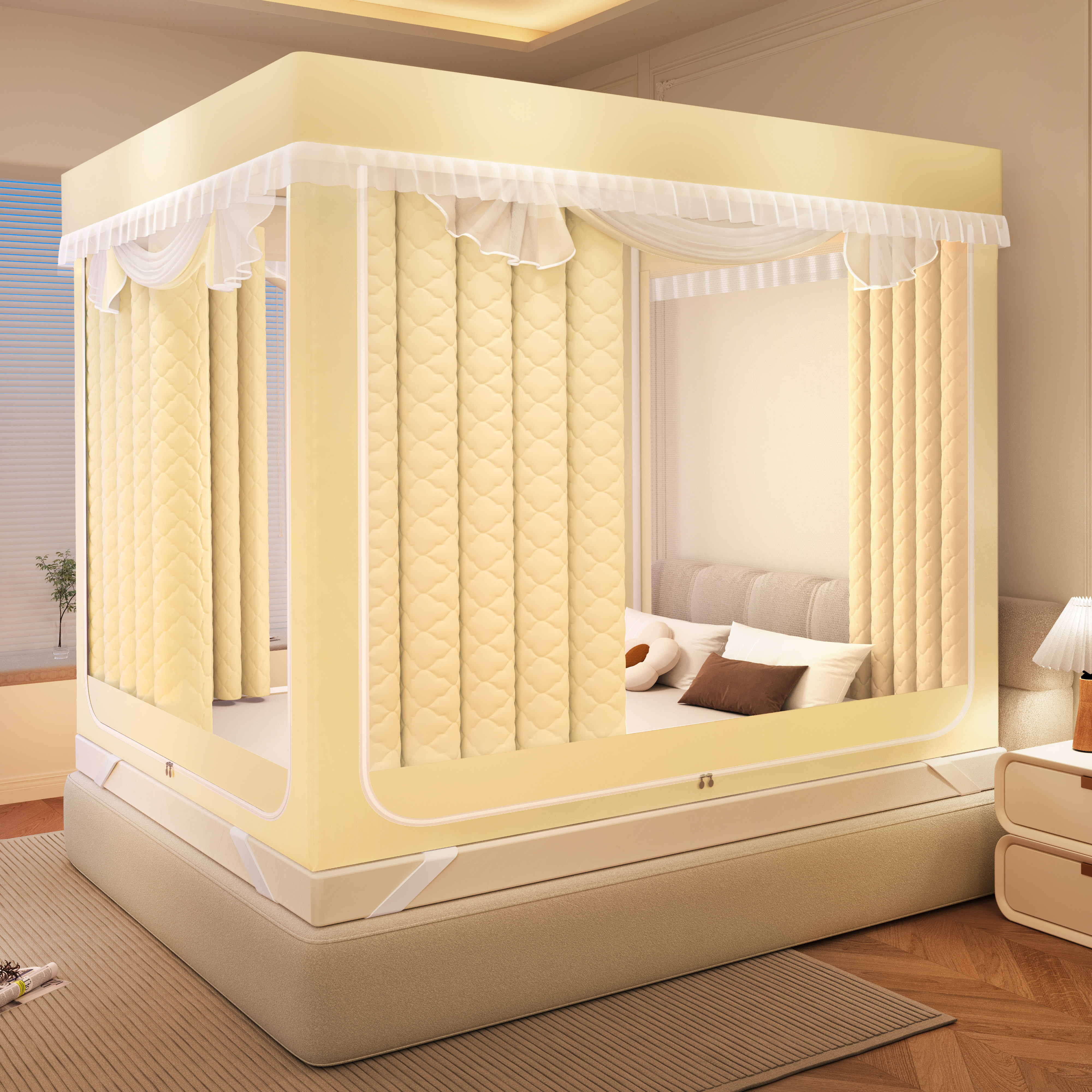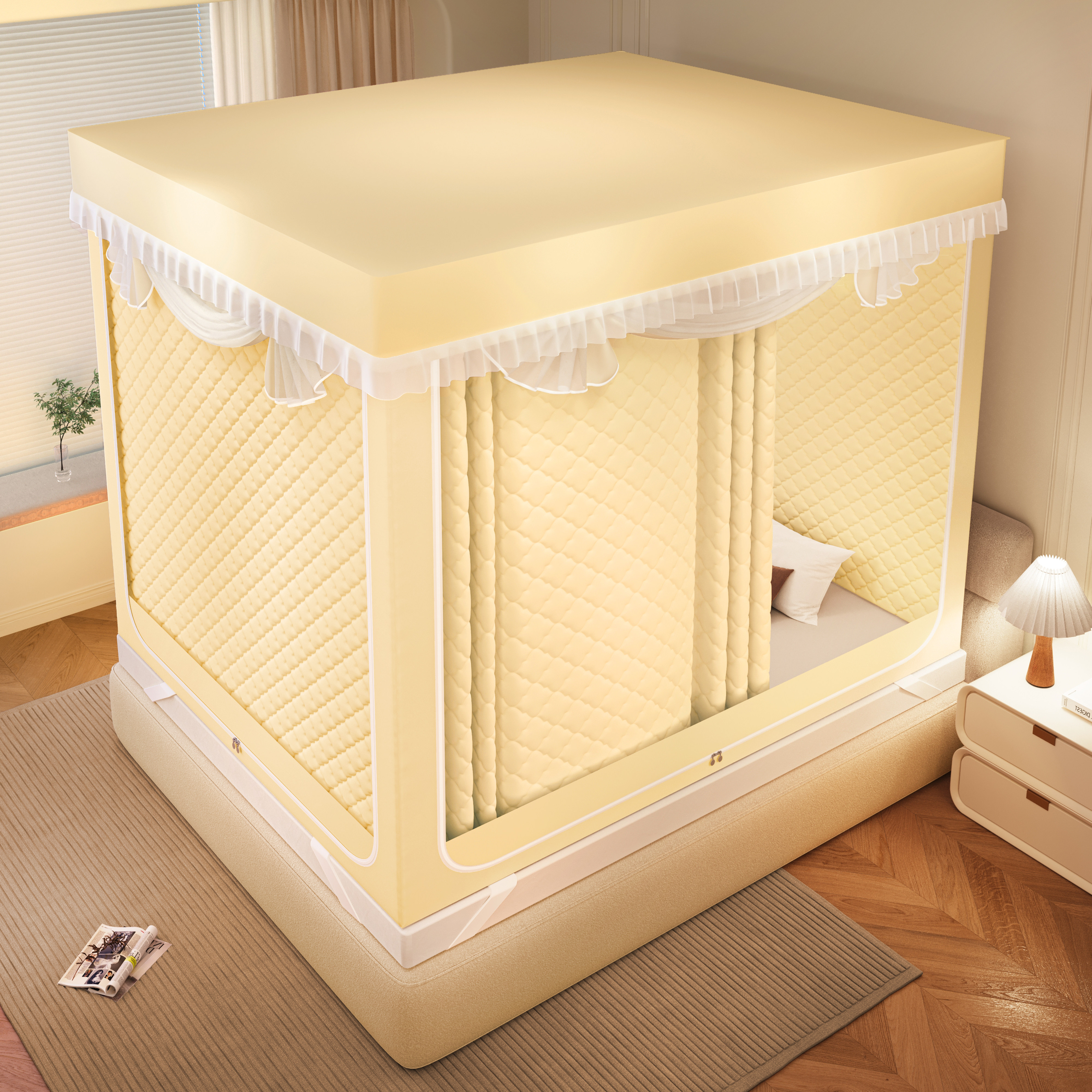 加厚冬季夹棉蚊帐遮光床帘保暖床幔,采用蒙古包式设计,兼具实用与美观。外层为高密度遮光面料,有效阻挡光线,营造静谧睡眠环境;内层填充优质夹棉,保暖透气,特别适合寒冷季节使用。全包围结构搭配底部固定设计,稳固防摔,保障儿童与成人安全。顶部设有隐形拉链,方便进出,同时有效防蚊虫侵入。适用于多种床型,安装简便,无需复杂工具。不仅提升卧室私密性与温馨感,更是一年四季皆宜的多功能床品,是家庭卧室的理想选择,兼顾健康、安全与舒适。