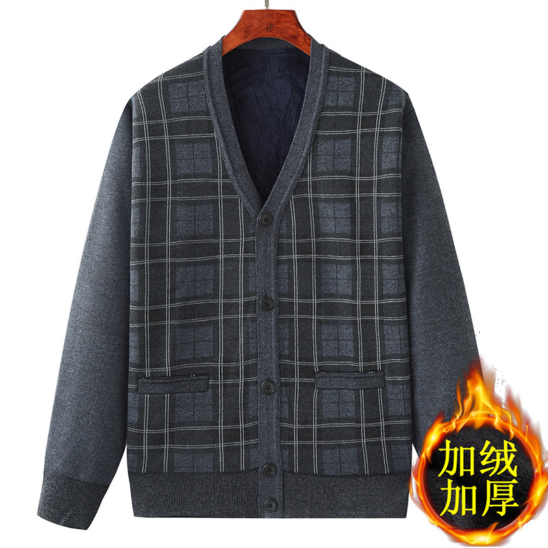 淘宝秋冬装中老年人男士V领毛衣爸爸加绒加厚保暖开衫爷爷针织外套