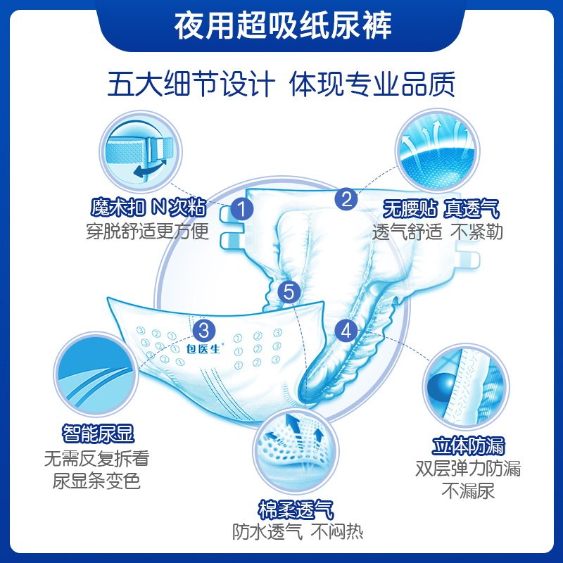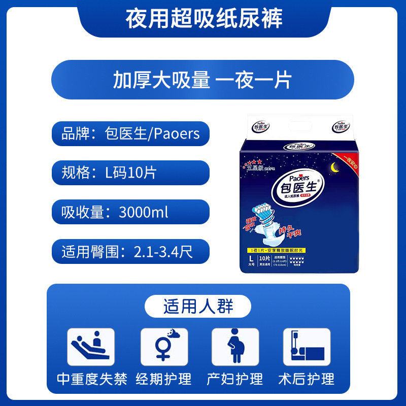 包医生成人纸尿裤专为失禁人群设计,适用于老人、术后患者及行动不便者,男女通用。采用高吸收芯体,快速锁水防漏,保持肌肤干爽舒适。拉拉裤式设计,穿脱便捷,贴身不勒,适合轻度至中度失禁使用。L码20片装,贴合腰围,侧边防漏隔边有效防止侧漏。表层柔软亲肤,减少摩擦刺激,呵护敏感肌肤。同时适用于女性经期护理,提供安心防护。一次性使用,卫生便捷,是家庭护理的理想选择。包医生以专业品质守护使用者尊严与舒适,让护理更轻松、更贴心。