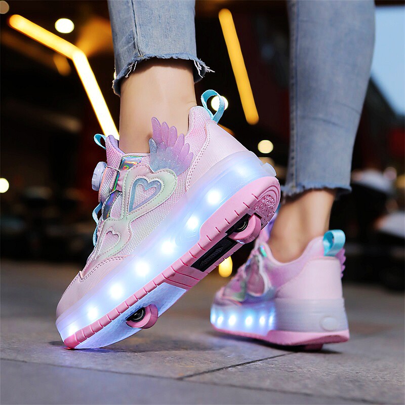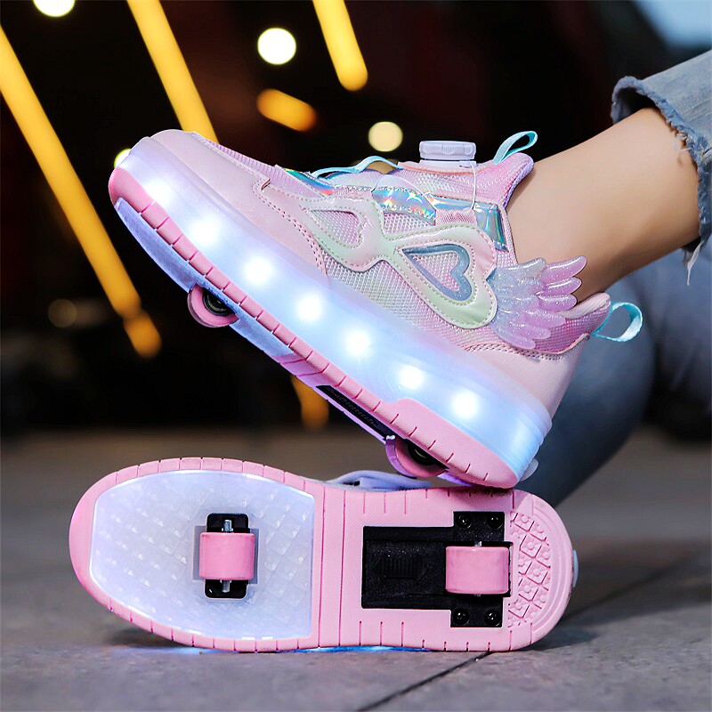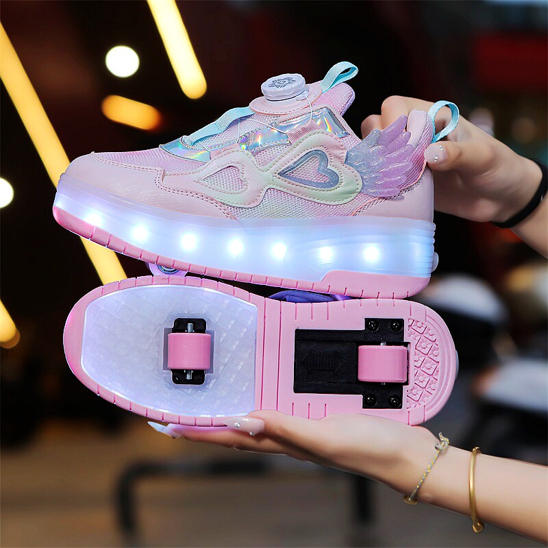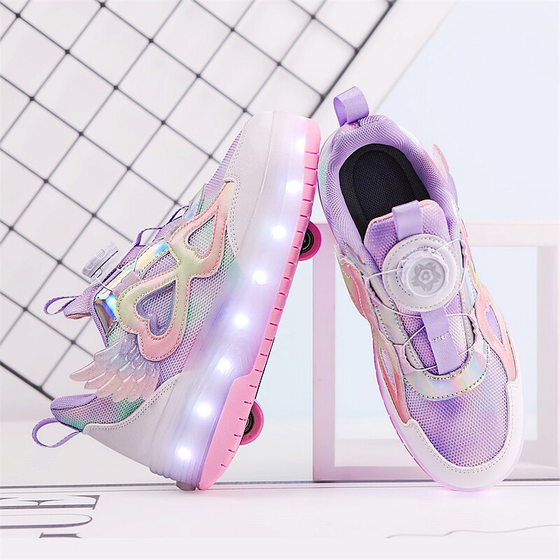 这款女童双轮可收缩飞行鞋,集时尚、趣味与安全于一体,专为活泼好动的学生设计。鞋身采用轻盈耐磨材质,搭配炫酷LED亮灯系统,行走或滑行时自动发光,夜晚出行更安全吸睛。隐藏式双轮设计,一键收缩,轻松切换步行与滑行模式,无需额外携带轮滑鞋。轮滑时静音顺滑,适合室内外多种地面,锻炼孩子平衡力与协调性。隐形轮滑结构让鞋子外观如普通运动鞋,日常穿搭不突兀。防滑耐磨鞋底,呵护双脚健康。是孩子运动、娱乐、上学的理想之选,让每一步都充满乐趣与光芒。