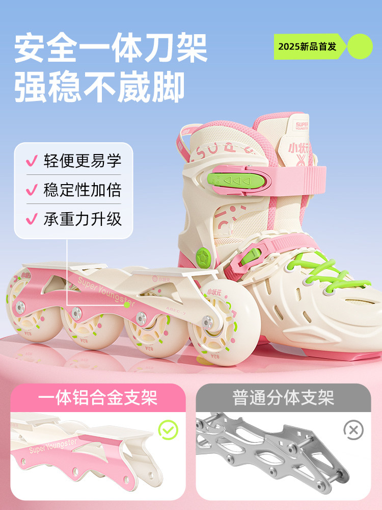 小状元轮滑鞋专为儿童初学者设计,适合男童和女孩使用,兼顾安全性与舒适性。采用高弹耐磨PU轮,抓地力强,滑行稳定,适合平花、休闲及直排轮滑多种场景。鞋壳采用高强度材质,提供良好支撑,保护脚踝;内胆透气柔软,可拆卸清洗,穿着更卫生。调节式鞋码设计,适应不同脚型成长,延长使用寿命。搭配专业刹车器,提升安全性,让孩子轻松上手,畅享滑行乐趣。小状元轮滑鞋是儿童入门轮滑的理想选择,助力孩子掌握平衡,培养运动兴趣,安全又时尚。