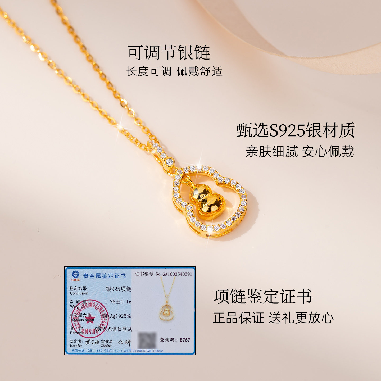 【新品首发】2026年新款金色葫芦银项链,专为优雅女性打造。采用高品质925银材质,表面镀金工艺,呈现温润亮泽的金色光泽,葫芦造型寓意福禄双全、平安吉祥。吊坠精致小巧,线条流畅,搭配细腻银链,轻盈贴合颈部曲线,尽显温婉气质。无论是日常佩戴还是出席重要场合,都能为整体造型增添亮点。新年将至,情人节临近,这款寓意美好的葫芦项链是送女友的贴心之选,承载浓浓爱意与祝福。包装精美,附赠礼盒,自用送礼两相宜,让爱在细节中绽放。