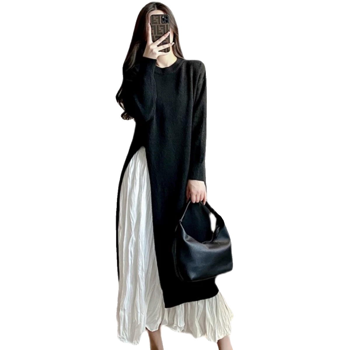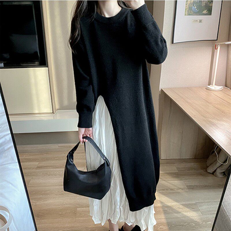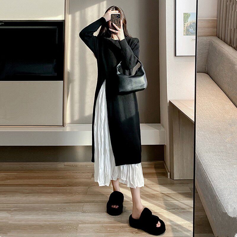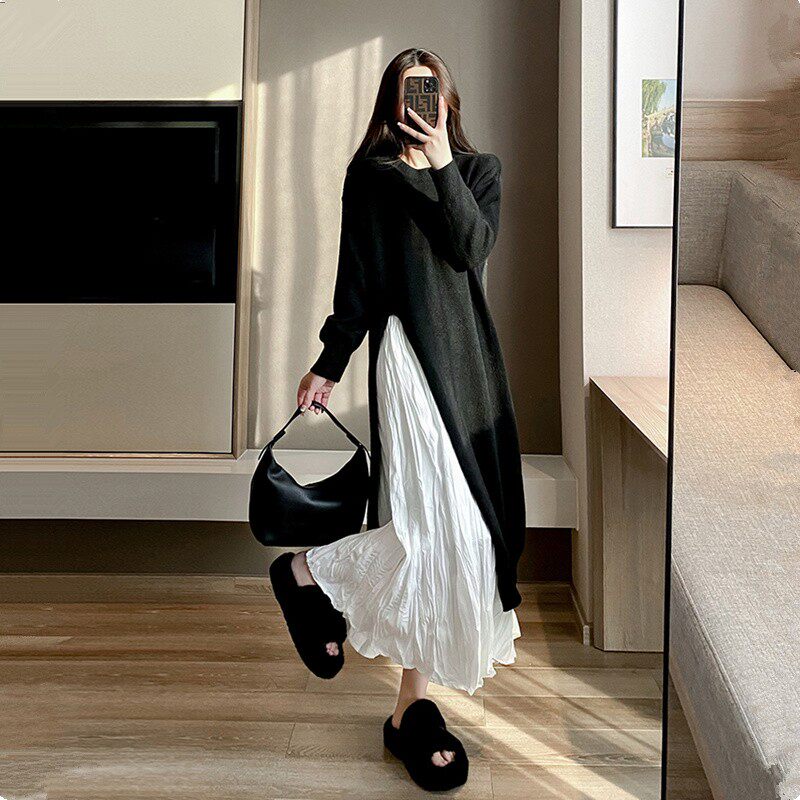 孕妇连衣裙2026新款秋冬黑色时尚显瘦假两件拼接中长款针织毛衣裙