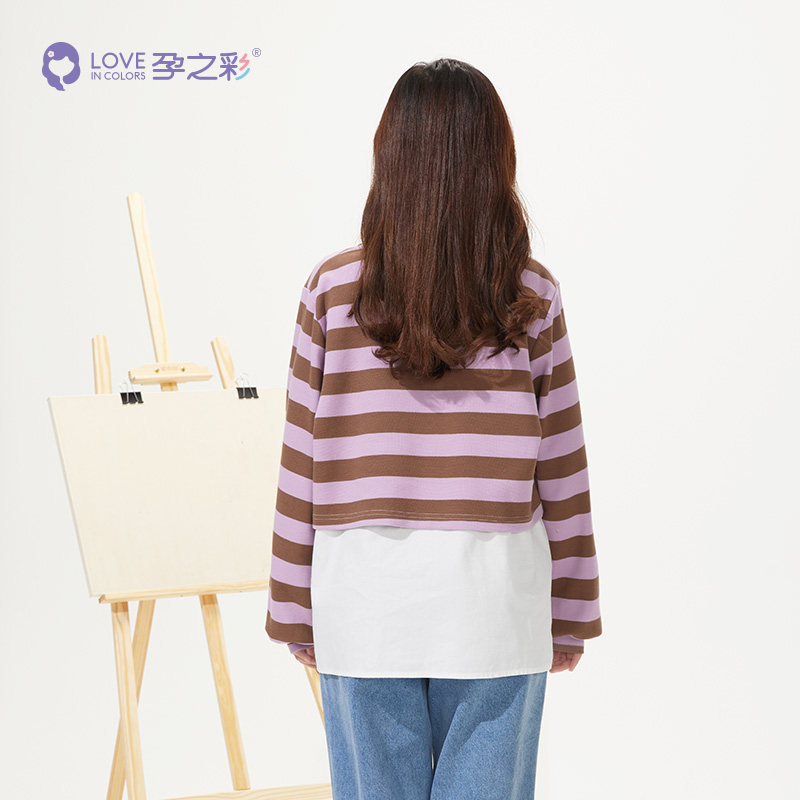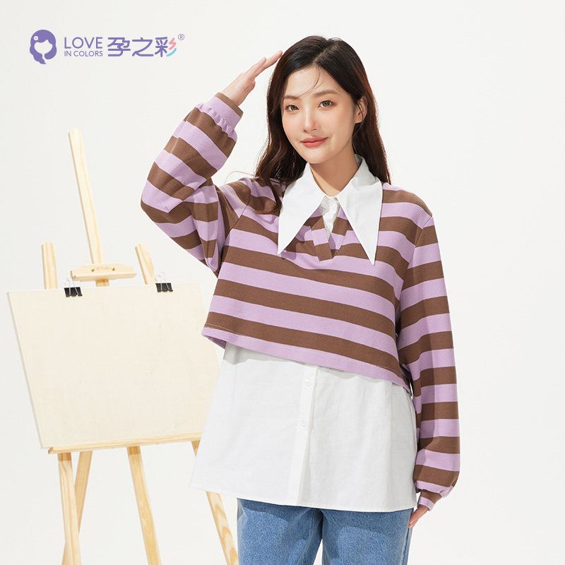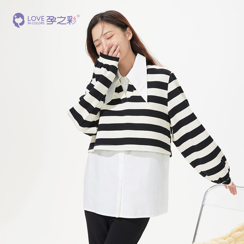淘宝孕之彩孕妇装上衣秋季新品减龄条纹可哺乳两件套简约通勤衬衫