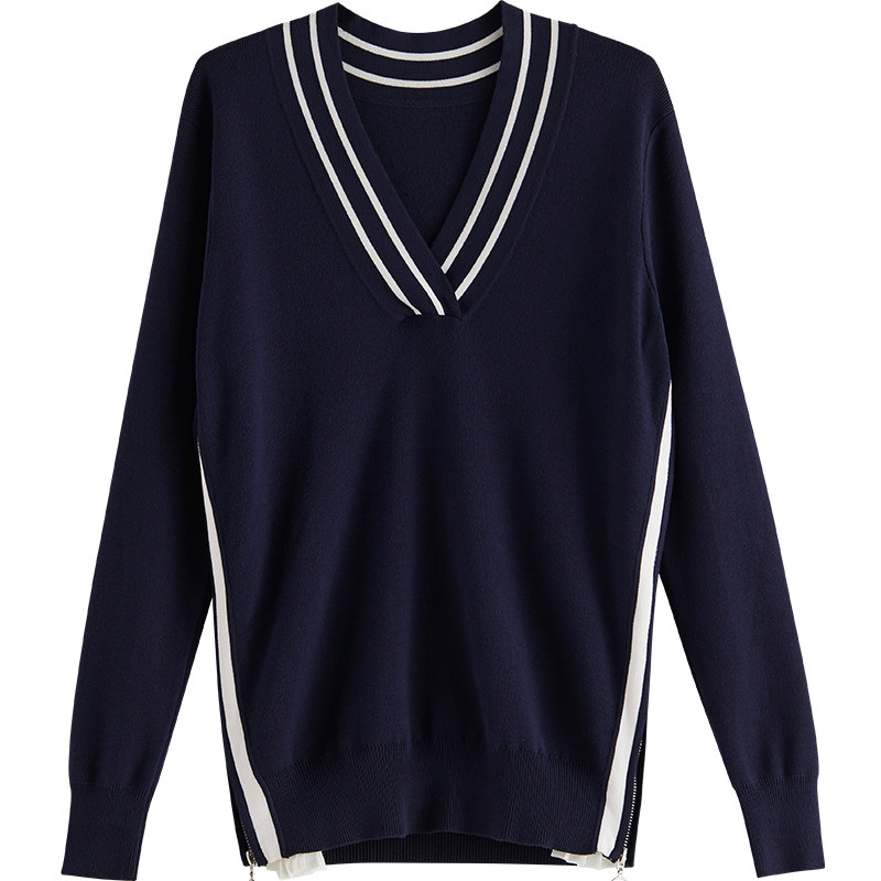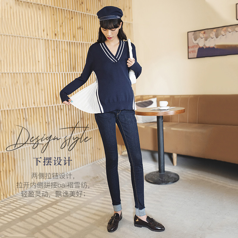 淘宝BELLYWEAR孕妇装春季毛衣时尚条纹V领针织雪纺压褶拼接外穿针织衫