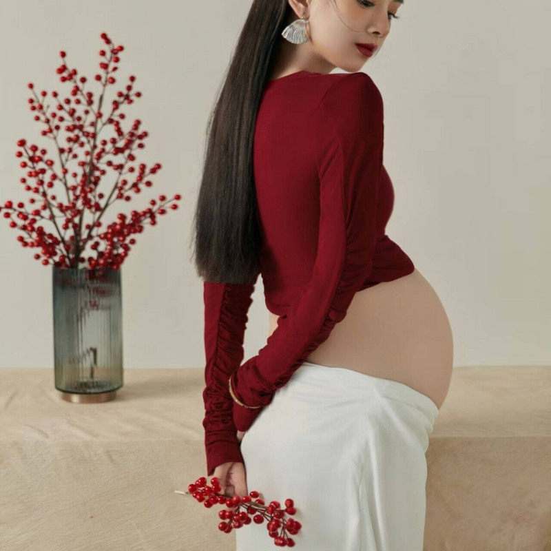 天猫孕妇装摄影服装红色上衣套装简约风室内拍摄影楼拍照在家拍复古风