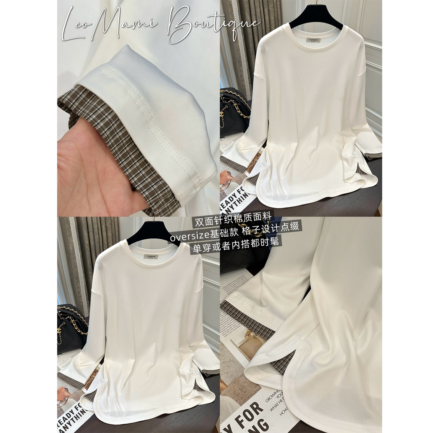淘宝LeoMami孕妇装秋季设计感格纹袖口拼接长袖T恤宽松时尚内搭上衣