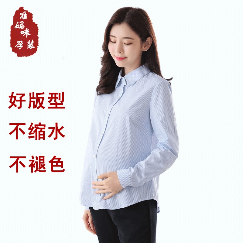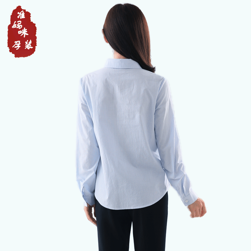 淘宝孕妇装职业衬衫长袖条纹工装短款纯棉上衣工作服春秋宽松上班衬衣