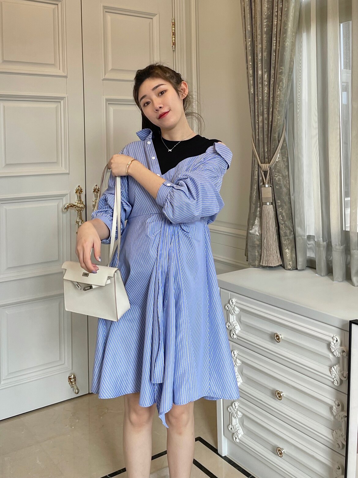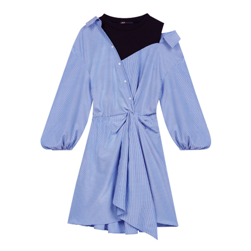 淘宝【LeoMami】高端孕妇装秋时尚设计感露肩假两件条纹衬衫连衣裙潮