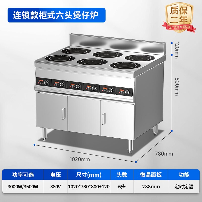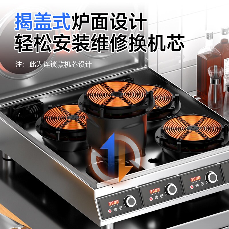 驰能商用电磁炉是一款专为餐饮行业设计的大功率平面多头电磁灶,具备双眼、三头、四头及六头多种配置,适用于煲辣烫、火锅、炖汤等多种烹饪场景。采用优质平面微晶面板,耐高温、易清洁,搭配高效节能的电磁加热技术,热效率高达90%以上,升温迅速、火力稳定。每个炉头独立控温,操作简便,满足不同菜品同时烹制需求。机身结构坚固,防水防油设计,适合商用高强度使用环境。驰能电磁灶仔炉兼具安全性与耐用性,是麻辣烫店、快餐店、食堂等场所的理想选择,助力提升出餐效率与经营效益。