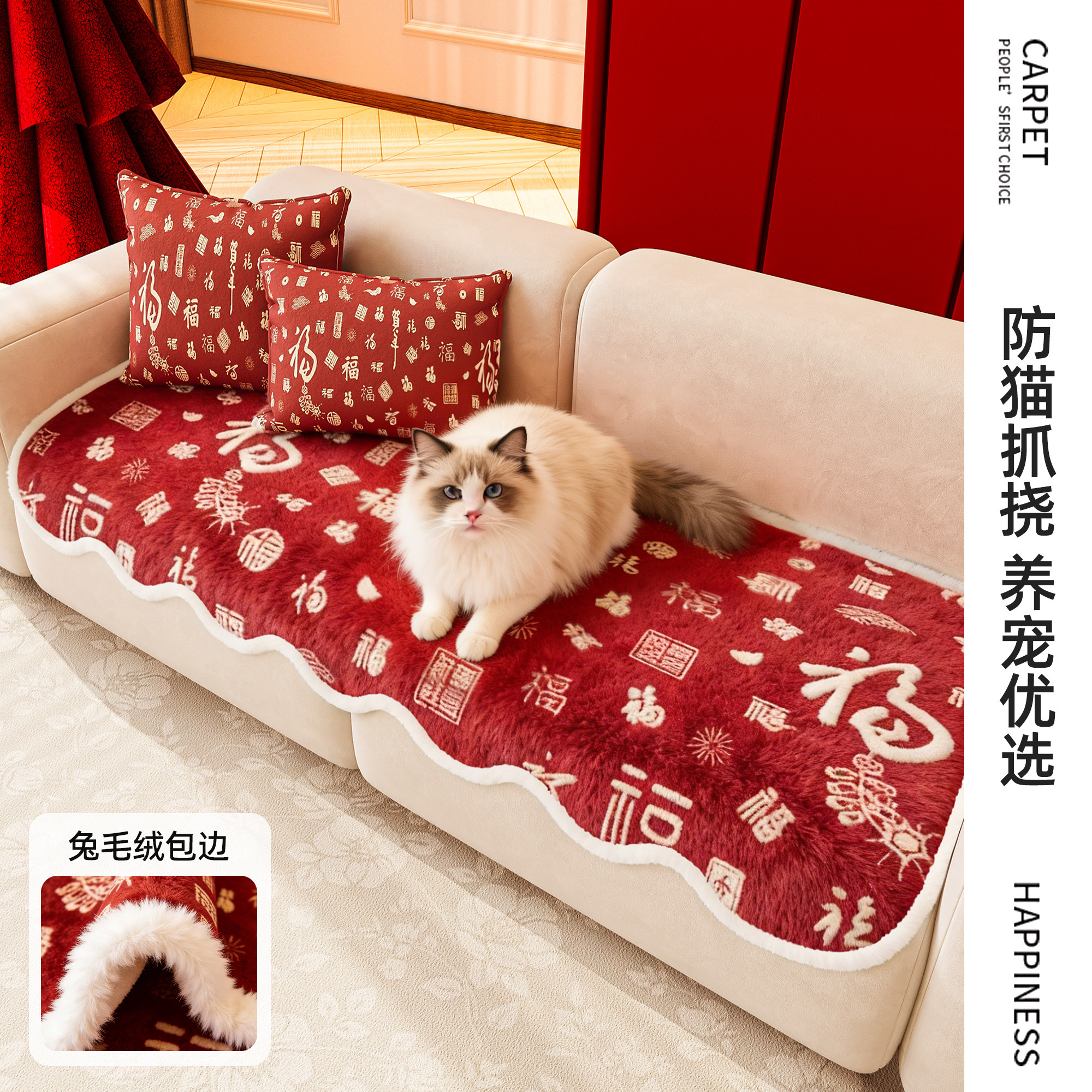 都市丽人红色喜庆沙发垫防水隔尿毛绒2026新款结婚防滑坐垫防猫抓
